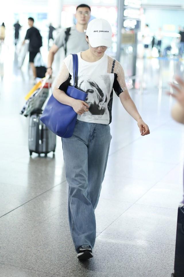 The hollow design of the sleeves of the white T-shirt increases the sense of design and instantly improves the sense of fashion. No matter how you pair it with wide-leg jeans, you will look younger. Jiang Qinqin The jeans you like can always visually reduce your age, so mature women can learn to wear them this way.