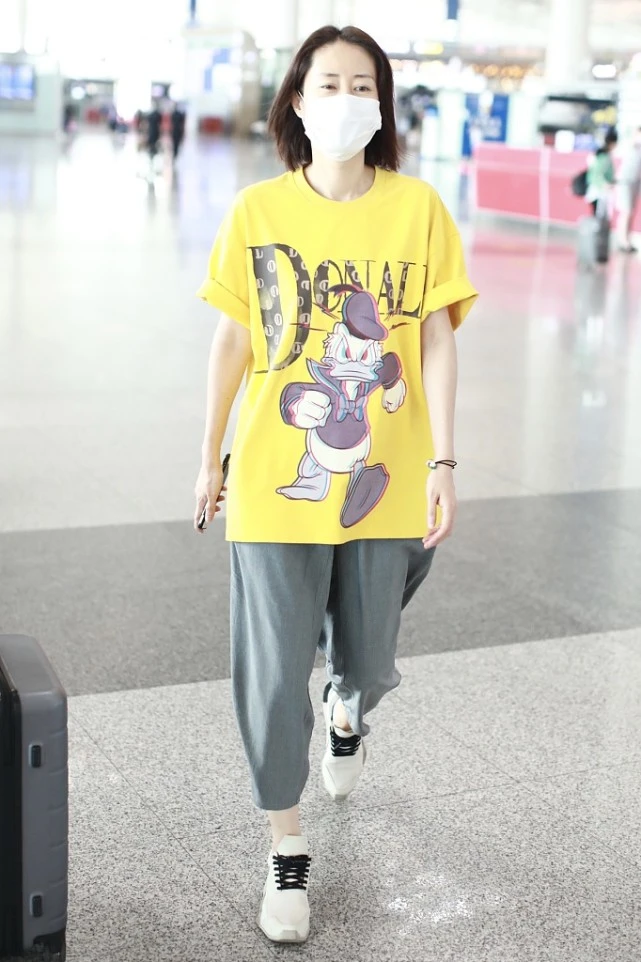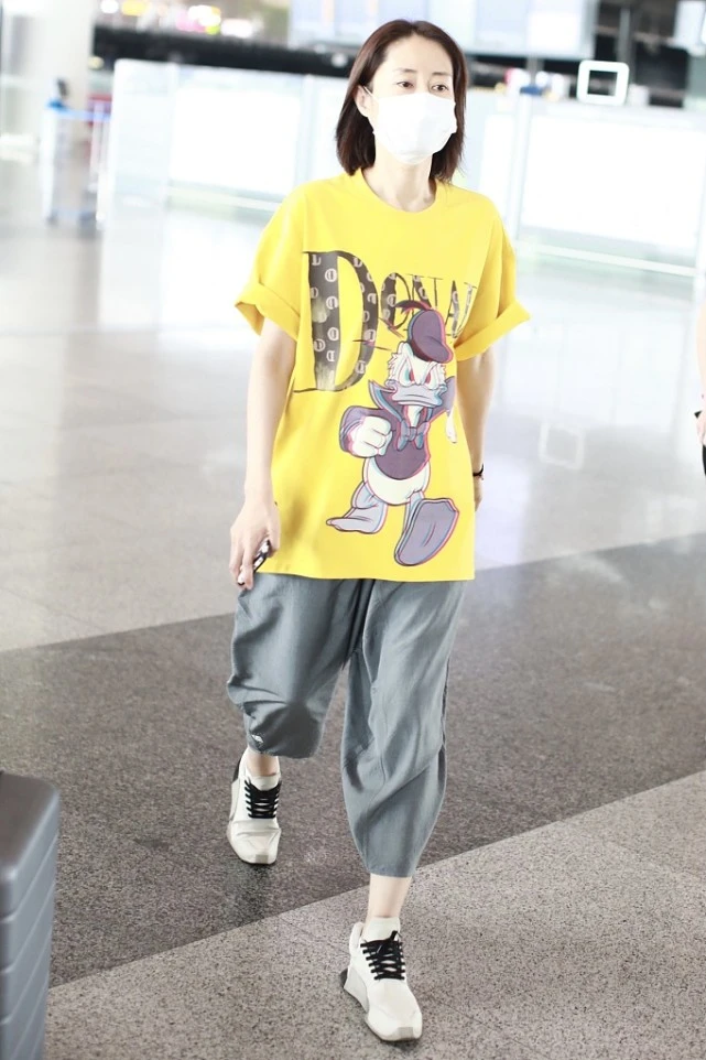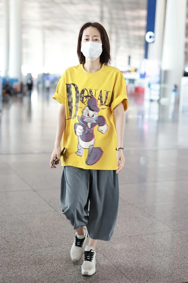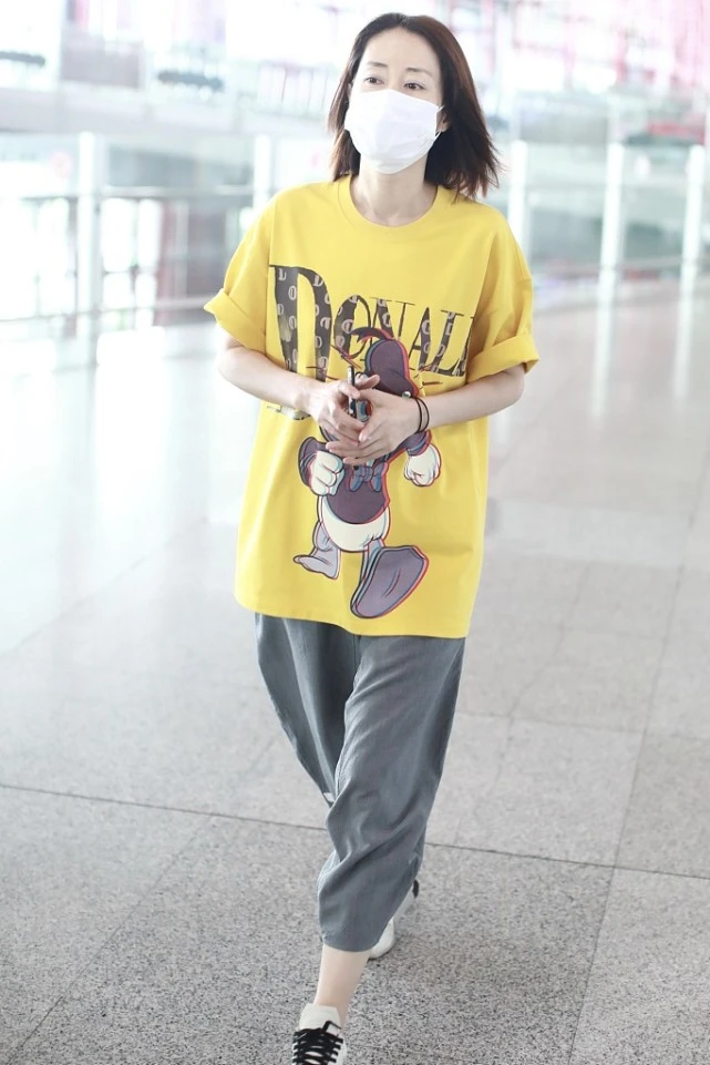 Liu Mintao, who appeared at the airport this time, chose a bright yellow T-shirt as his main match, giving him an eye-catching novelty! The loose T-shirt itself is particularly eye-catching. The large-area patterns and English printed letters are added to make it more energetic. The increase in age has not weakened her love for beauty, and her pursuit of fashion taste is becoming more and more advanced.