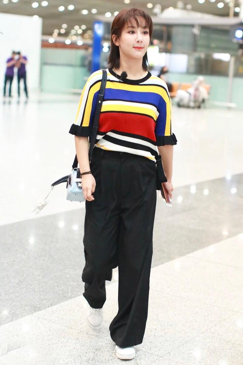 The striped T-shirt will give people a The feeling of shortening the proportions of the upper body, combined with the three primary colors of red, yellow and blue, makes people feel bright. Choosing loose black trousers is bright and comfortable, giving it a color palette girl feel.