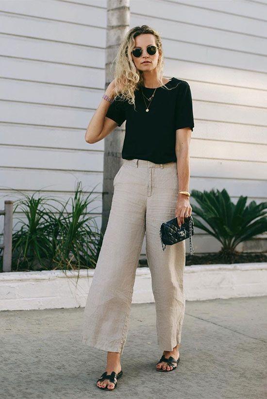 A black round-neck T-shirt is paired with off-white cotton and linen wide-leg pants. The high-waist design makes the legs look longer. Pair it with a tight-fitting cotton T-shirt. Loose wide-leg trousers create a tight-fitting, loose-fitting feel that can flatter your figure. Simply tie your hair up and pair it with a straw bag for a casual and lazy look.