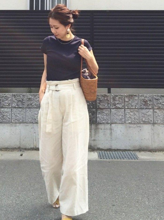 Nine-point pants are smart and streamlined. It is also paired with a solid-color black round-neck T-shirt, but it gives a simple and neat look. The nine-point wide-leg pants made of beige linen material are combined with loose-fitting short sleeves. Paired with black slippers, the ankles that are just exposed exude a woman’s sex appeal. Pair them with some textured accessories to fully open up your aura!
