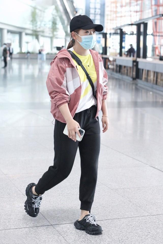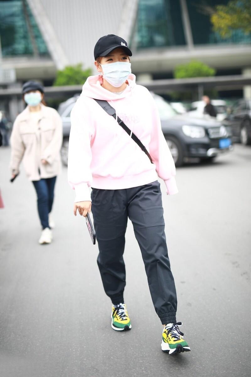 The color-blocking jacket is made of lotus pink and white, which is fresh and feminine. The long-sleeved shirt worn inside is also a color-blocking design, which echoes the inside and outside, making it unique and novel. . Once again, she chose a combination of sports pants and sneakers, which is full of sports style. Although the overall style is relatively simple, her personal charm is also quite amazing.