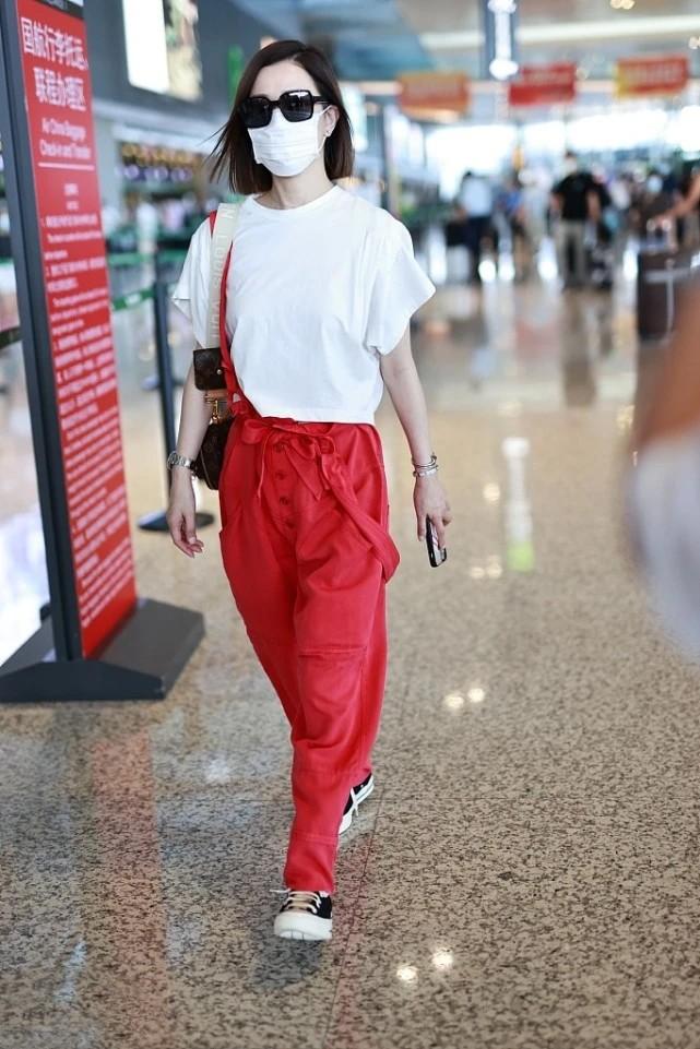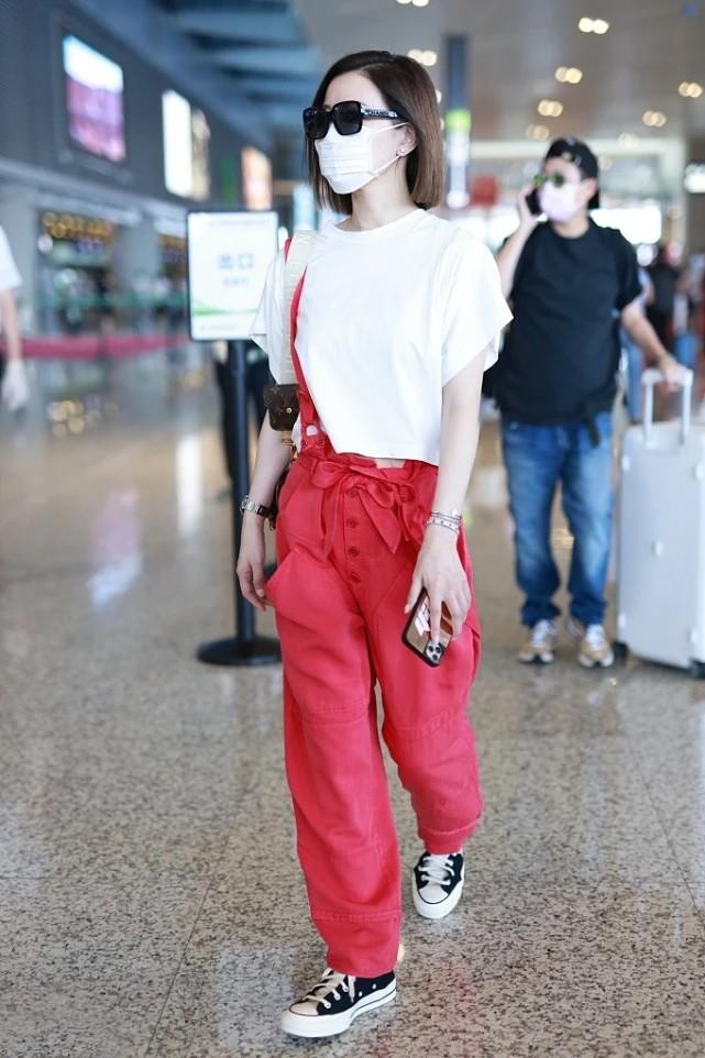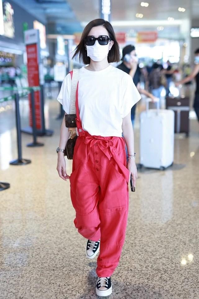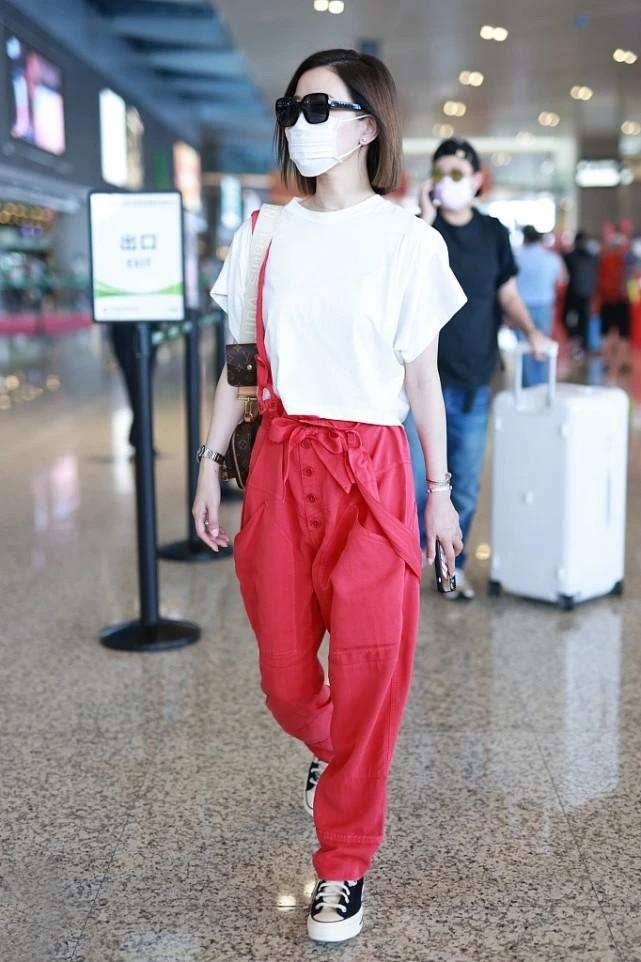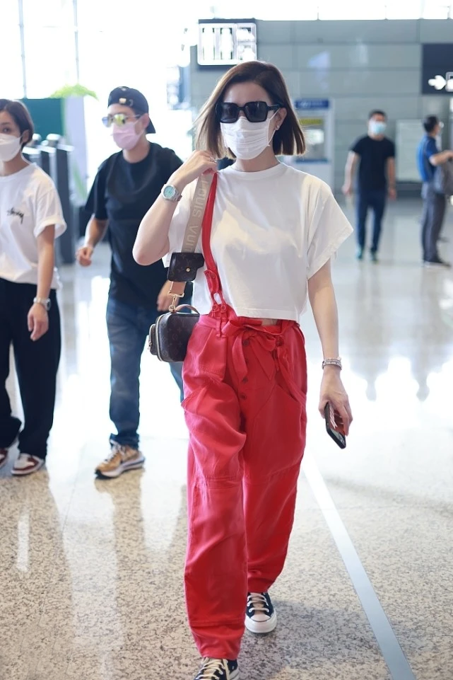 The eye-catching overalls naturally need a low-key item to bring out its uniqueness and vitality. Charmaine Sheh chose a basic pure white T-shirt as her top. The simple and elegant red and white combination retains the passionate vitality of the trousers without being too ostentatious. At the same time, the short T-shirt raises the waistline and greatly elongates the proportions of the legs, thus showing a better figure. It seems simple but has hidden tricks.