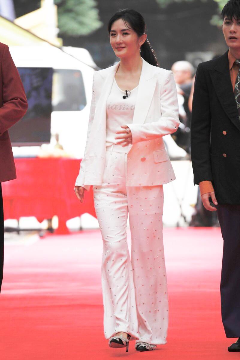 Xie Na’s upper body still remains slim and well-proportioned, so she can use a slimmer suit to create a smart look. She has a slightly bulging belly and much thicker legs. The lower part is covered with wide-leg pants to make the figure more proportionate.