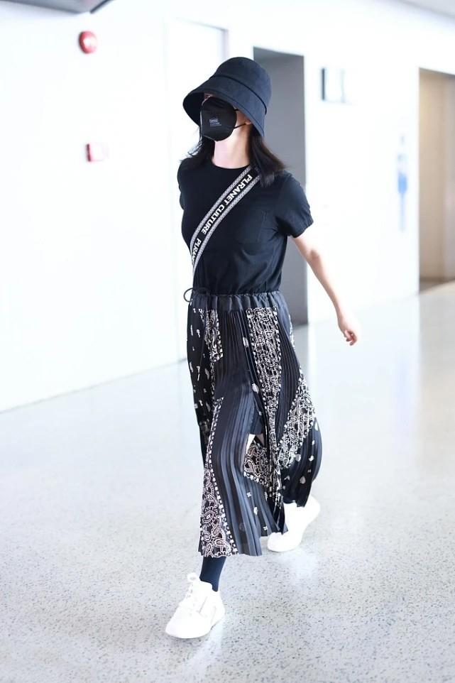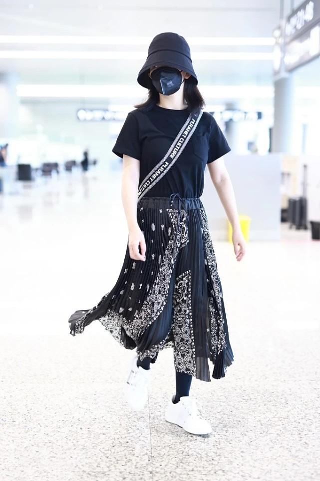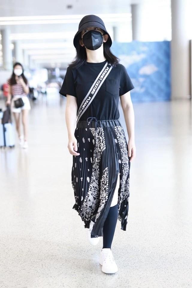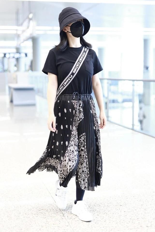 First of all, although the overall matching is a single color, Xie Na does not use solid colors to shape the look, but adds a combination of traditional and simple print designs to create a sense of hierarchy and make the outfit more harmonious. The pure black T-shirt is simple and low-key, while the patchwork printed long skirt is full of dynamic. The combination of the two forms a simple and traditional combination, which makes the look even more outstanding.