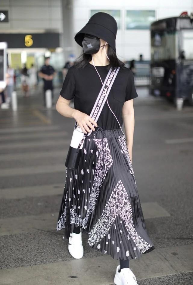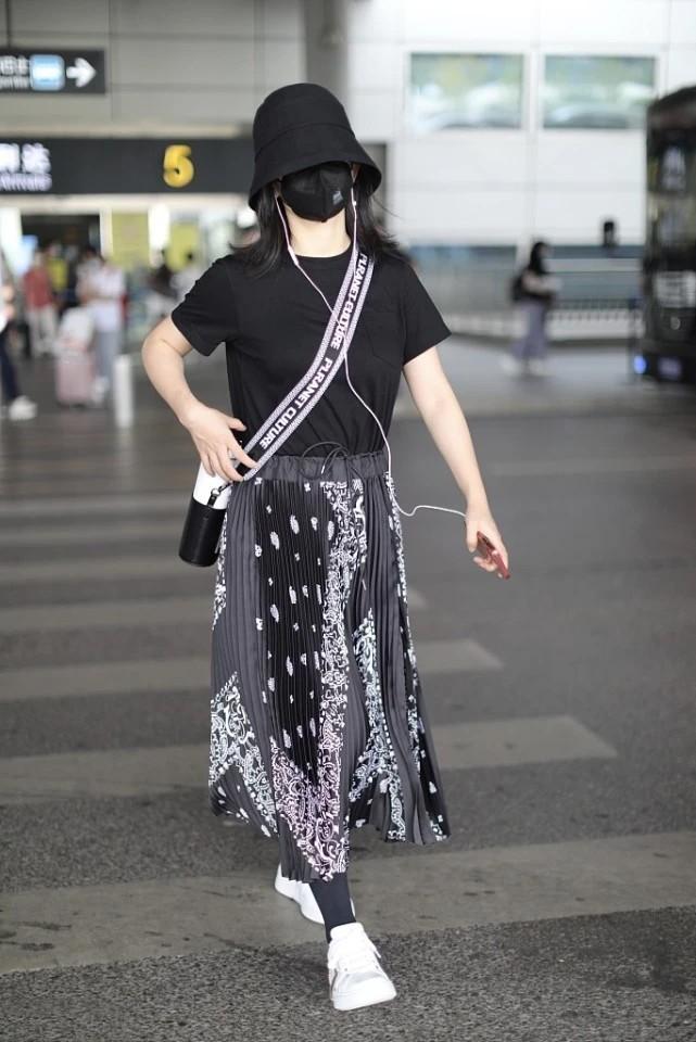 Although Xie Na’s outfit is not complicated, her fashion attitude can still be seen. Of course, the fashion effect created by the simple matching is also quite Yes, a basic T-shirt is paired with a flowing printed long skirt with slits. The whole outfit is harmonious, elegant and fashionable for an age-appropriate look.