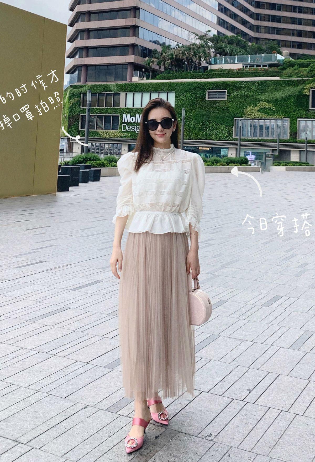The fluffy gauze skirt is a light lotus pink color, which is very elegant and very feminine. Paired with a white lace T-shirt, this is a very designed top, which adds a lot to the whole outfit and adds a touch of playfulness to the whole person.