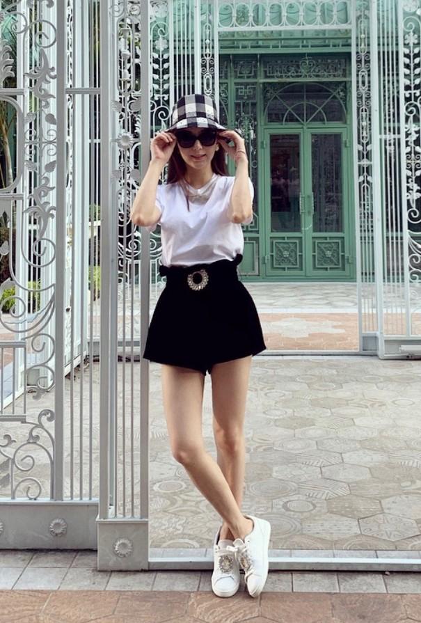 The simple white T-shirt is a simple and slim-fitting style. Look It goes up easily and also outlines her better figure. Paired with white dad shoes, it is clean and refreshing, and the whole person seems to have inexhaustible energy.