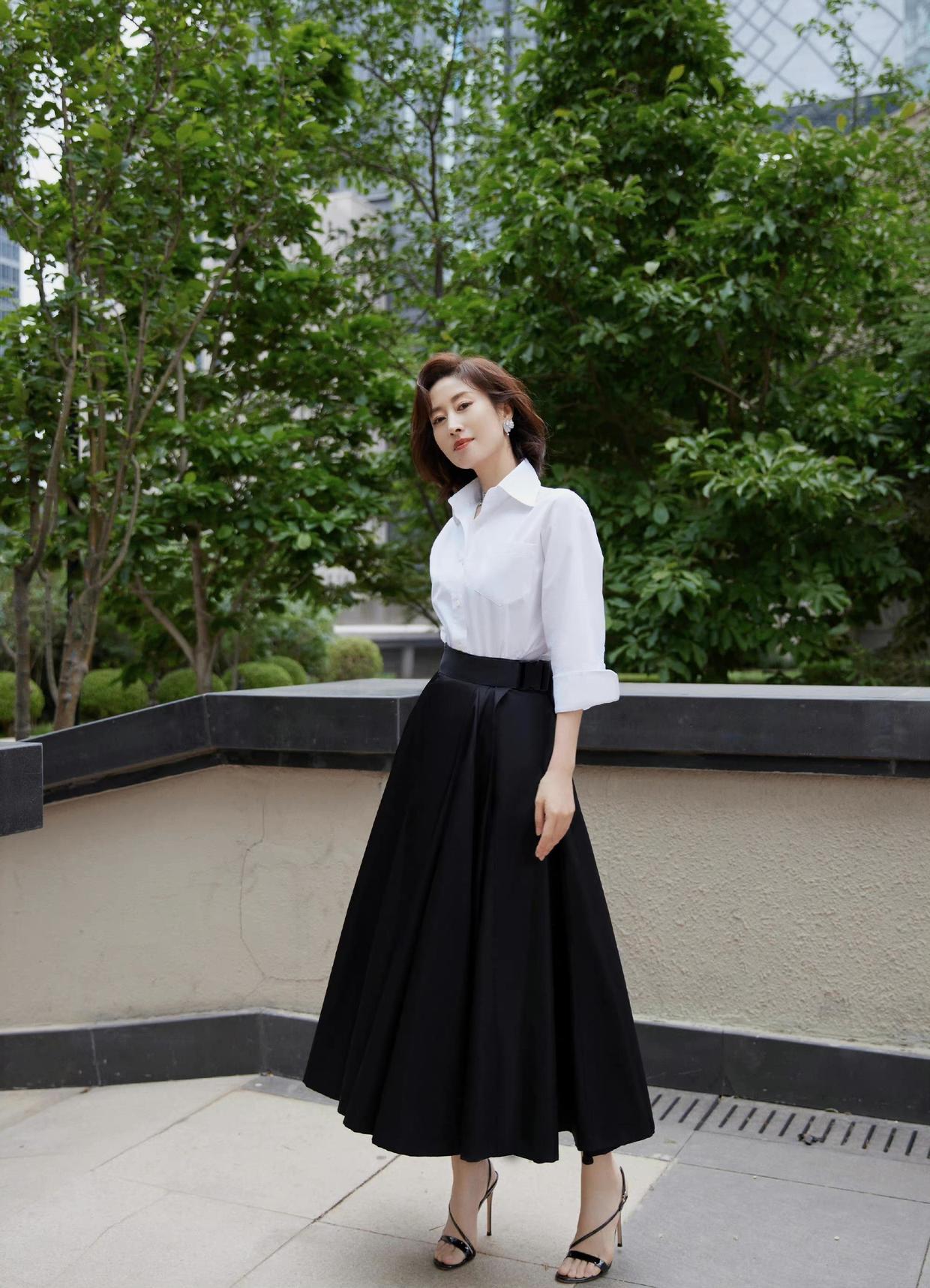 A white shirt paired with a black skirt, this look is elegant , and very decent. A white shirt tucked into a high-waisted skirt can adjust the waist and create your good proportions. This black and white combination is very classic. Women can try it whether they are 20 or 50 years old. It is quite advanced.