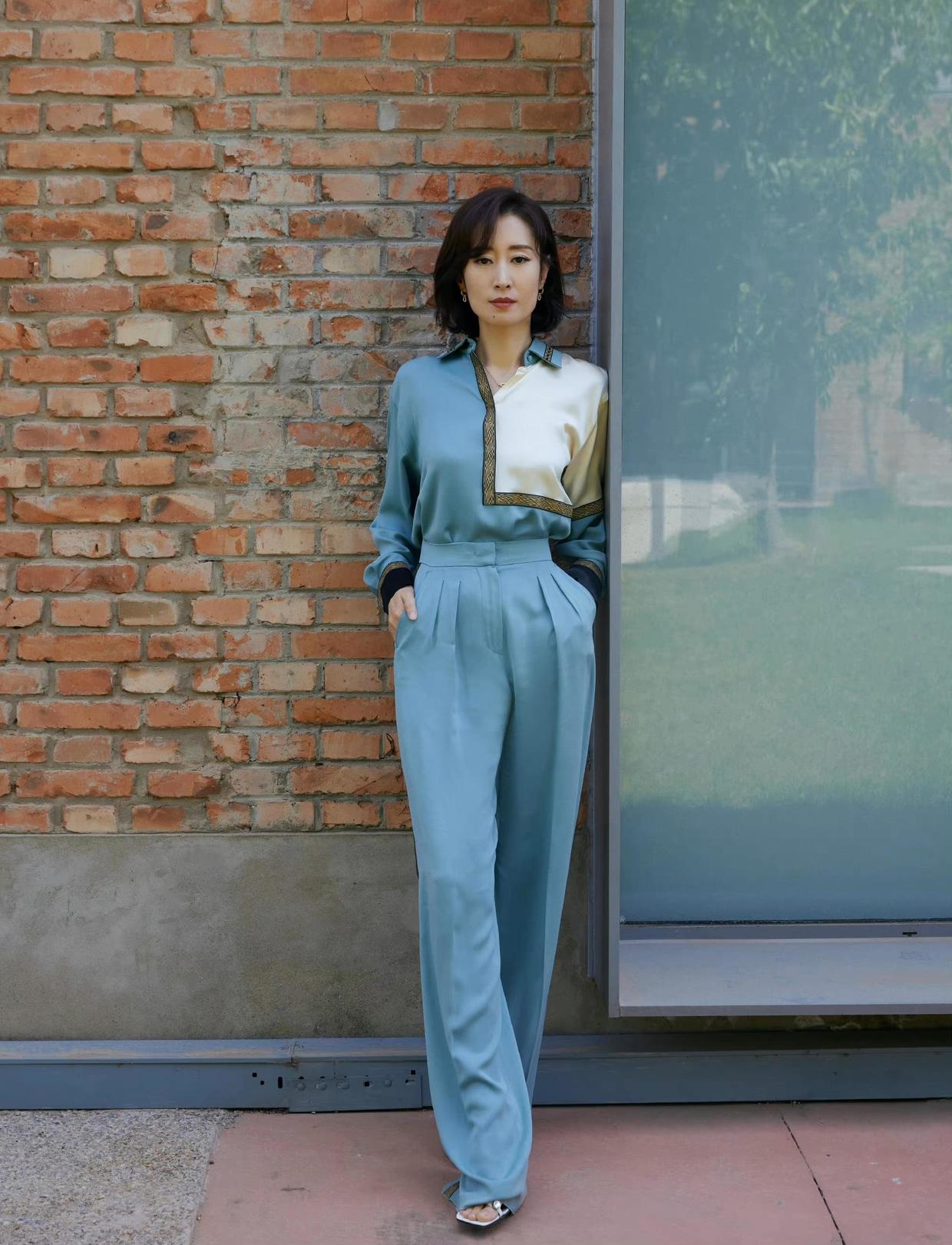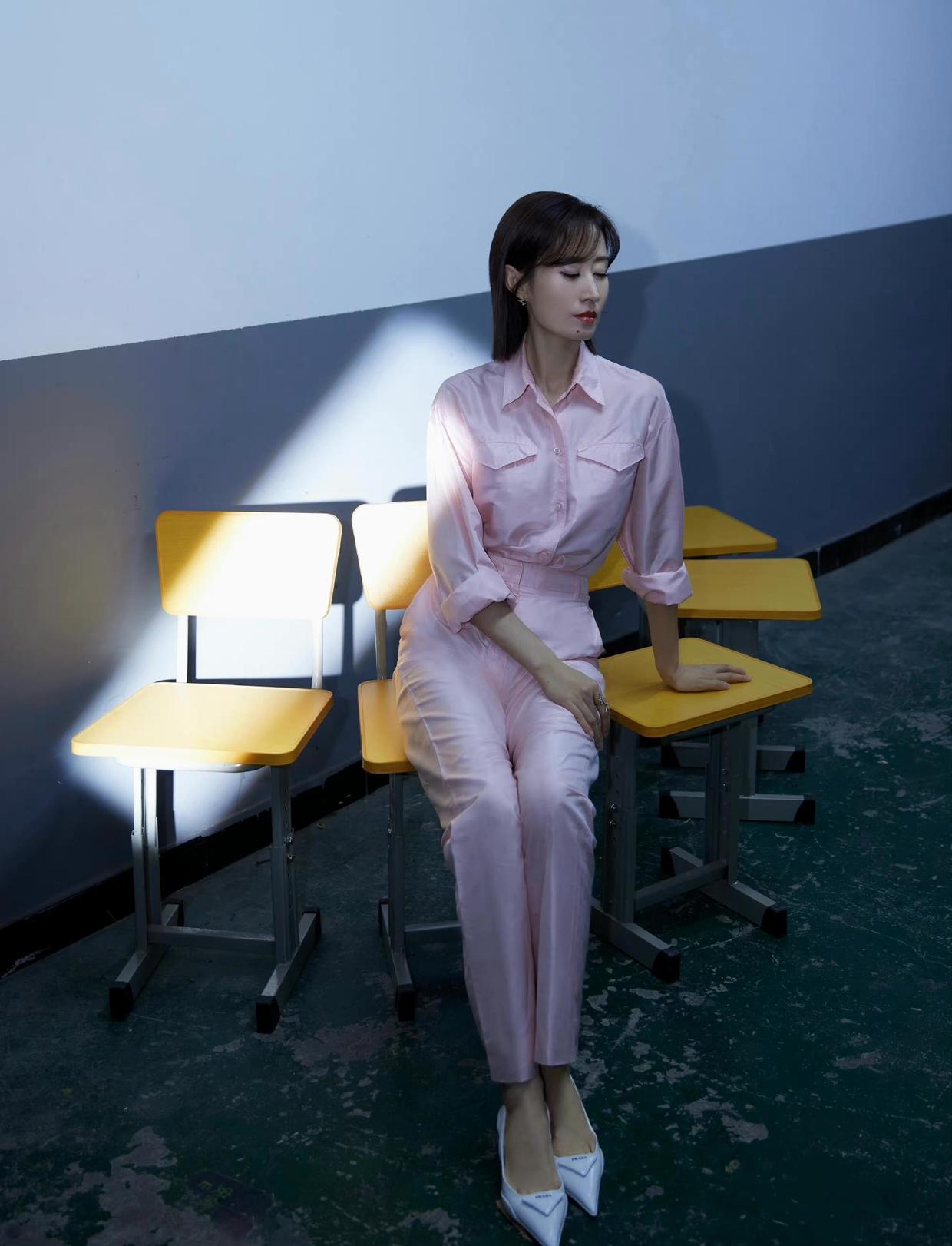 There are many ways to match shirts. The simplest is this shirt suit, which saves time and effort. When Liu Mintao chose a pink shirt suit with a concave shape, it also showed It has a personal charm and looks very young.