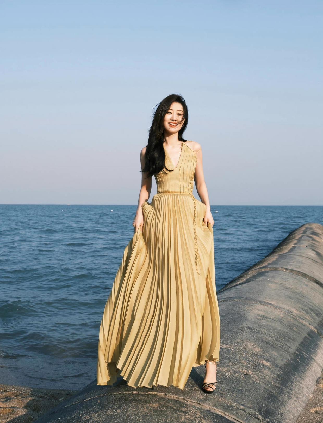 Female friends can consider some different designs when choosing a dress. The pleat processing on Liu Mintao’s dress below can also show a sense of hierarchy. The pleated skirt shows a smart and elegant feeling. Although the skirt It is very long, but it is not boring at all when worn. Especially the upper body is very slim, which outlines her curves and has an excellent slimming effect.