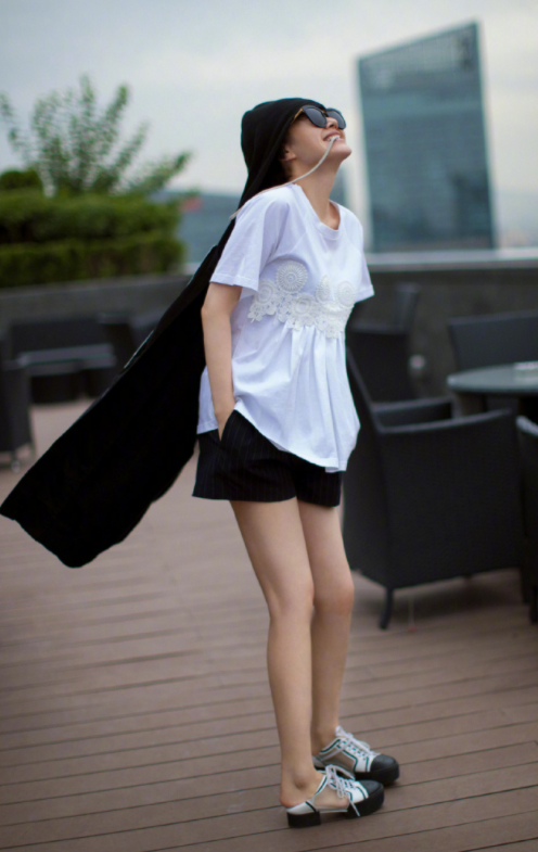 Xu Qing especially likes to wear T-shirts. There are many interpretations of simple white T-shirts. For example, Xu Qing’s white T-shirt below is paired with shorts, which looks casual and relaxed, and can also be modified. Long legs.