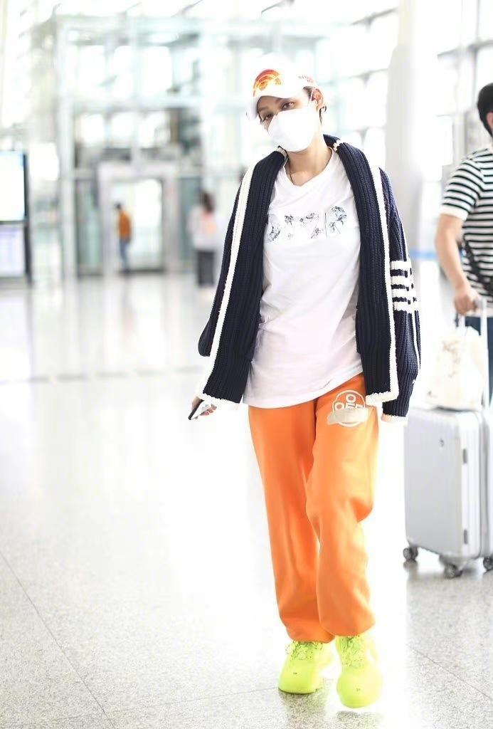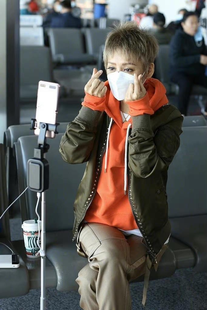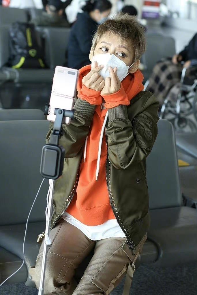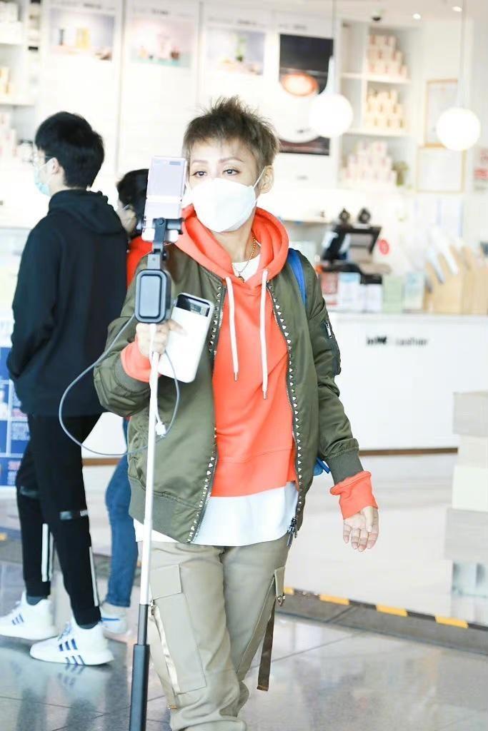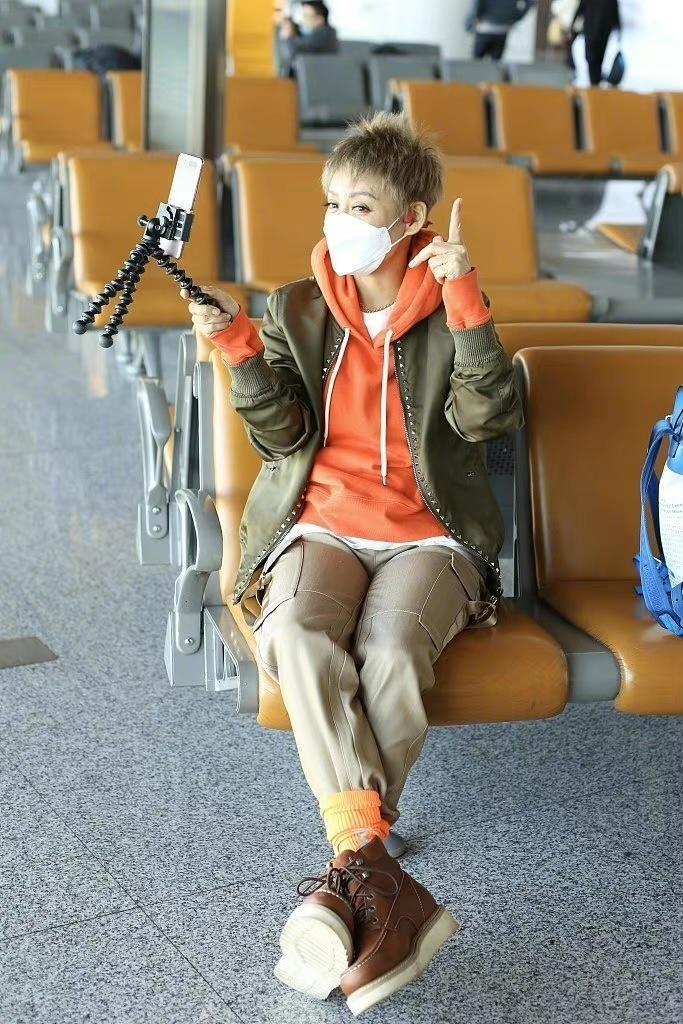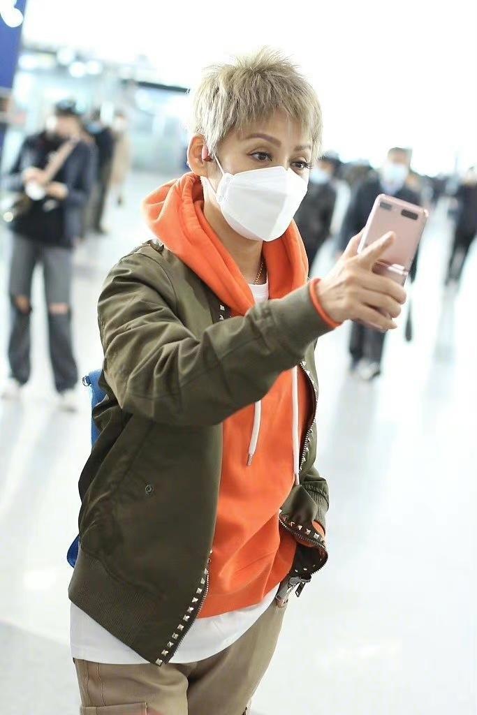 Tranquility is nothing like 50 For a 20-year-old person, she has always had a youthful mentality. She is very good at matching outfits and can pull off any look. This time, she paired herself with a casual jacket and an orange sweatshirt, which gave her a strong sense of layering. With her short hair cut, she looked cool and really fashionable.