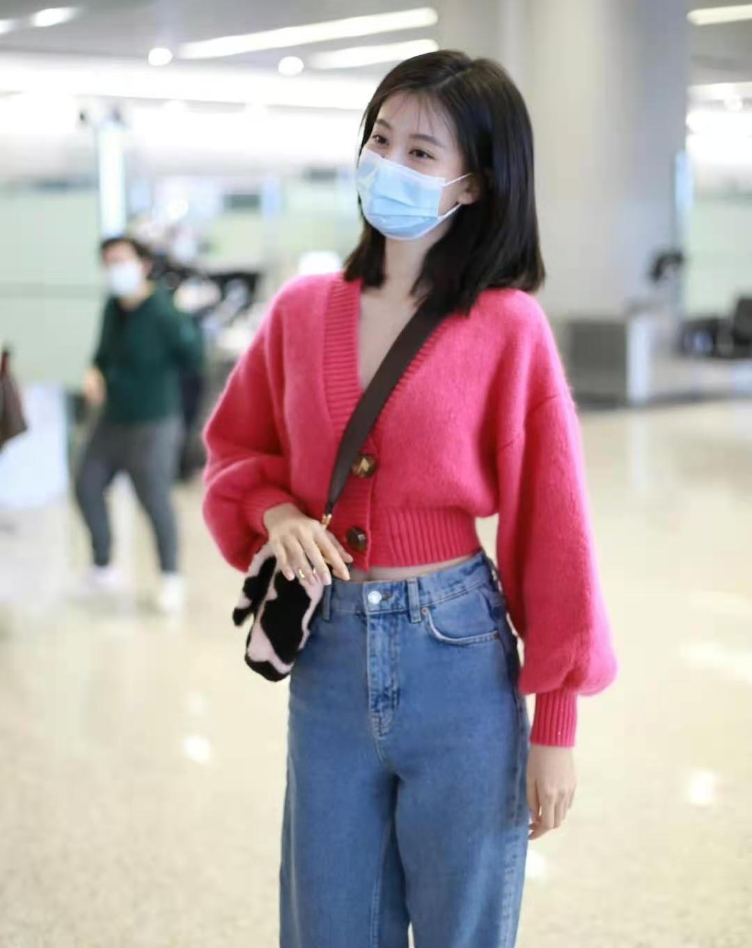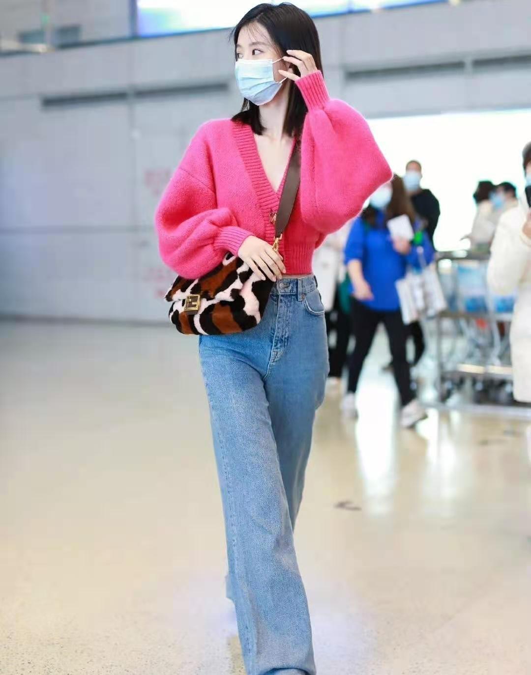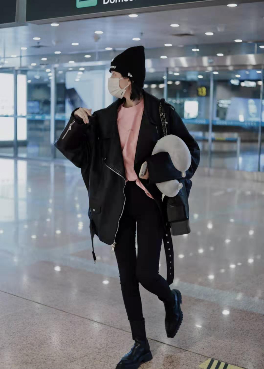 Qiao Xin is indeed a fashionista (wearing a leather jacket + pink T-shirt when walking to the airport looks sweet, sassy and beautiful)