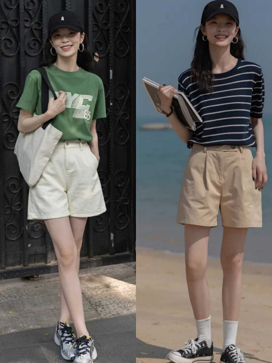 If your legs are not very long, you can learn from shorts for summer matching The combination, coupled with a short-sleeved T-shirt, makes the styleIt looks relatively simple and casual, and is easy to control. The shorts in the picture below are also relatively loose, which can cover the fat on our thighs and make us lose ten pounds!