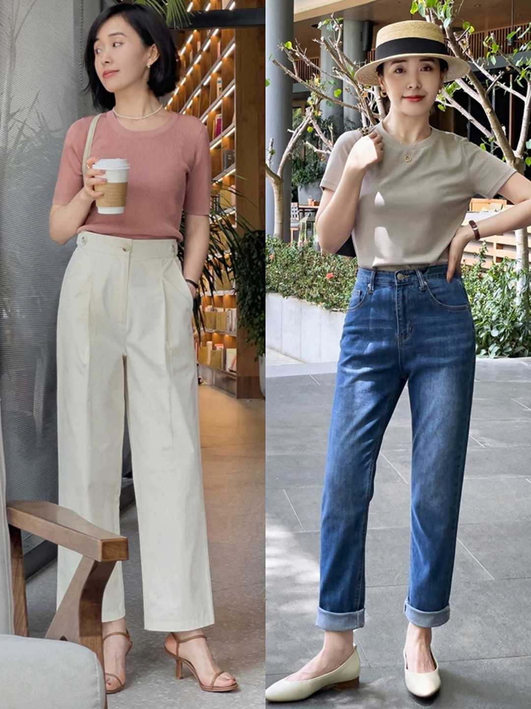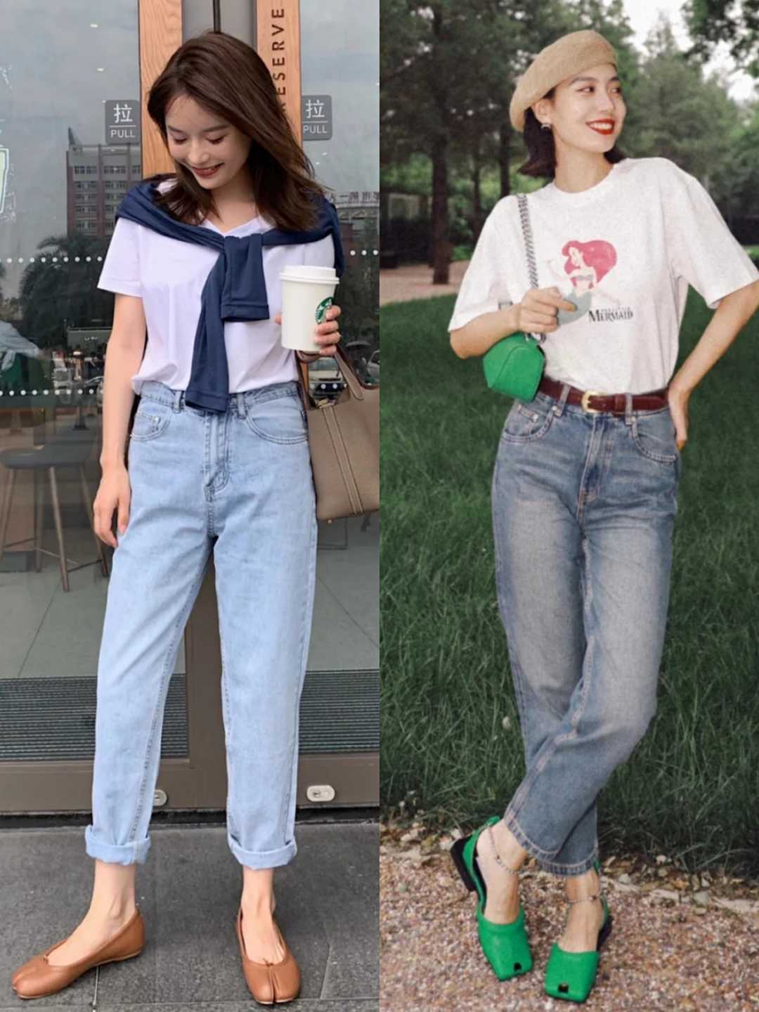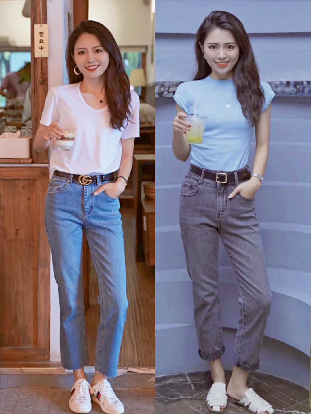 First of all, you can learn from basic jeans and short-sleeved T-shirts. This kind of The matching is still very fashionable and can reflect the fashionable and individual style, and this kind of high-waisted jeans is paired with a T-shirt, and the position of the waistline can be reflected, making it taller and slimmer.