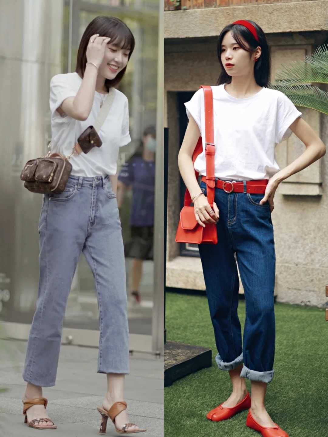Pair a white short-sleeved T-shirt with light blue jeans. This style is very classic and can be directly used for daily matching. Moreover, this light-colored combination is very suitable for spring and summer and looks lighter. Overall it doesn’t feel too dull.
