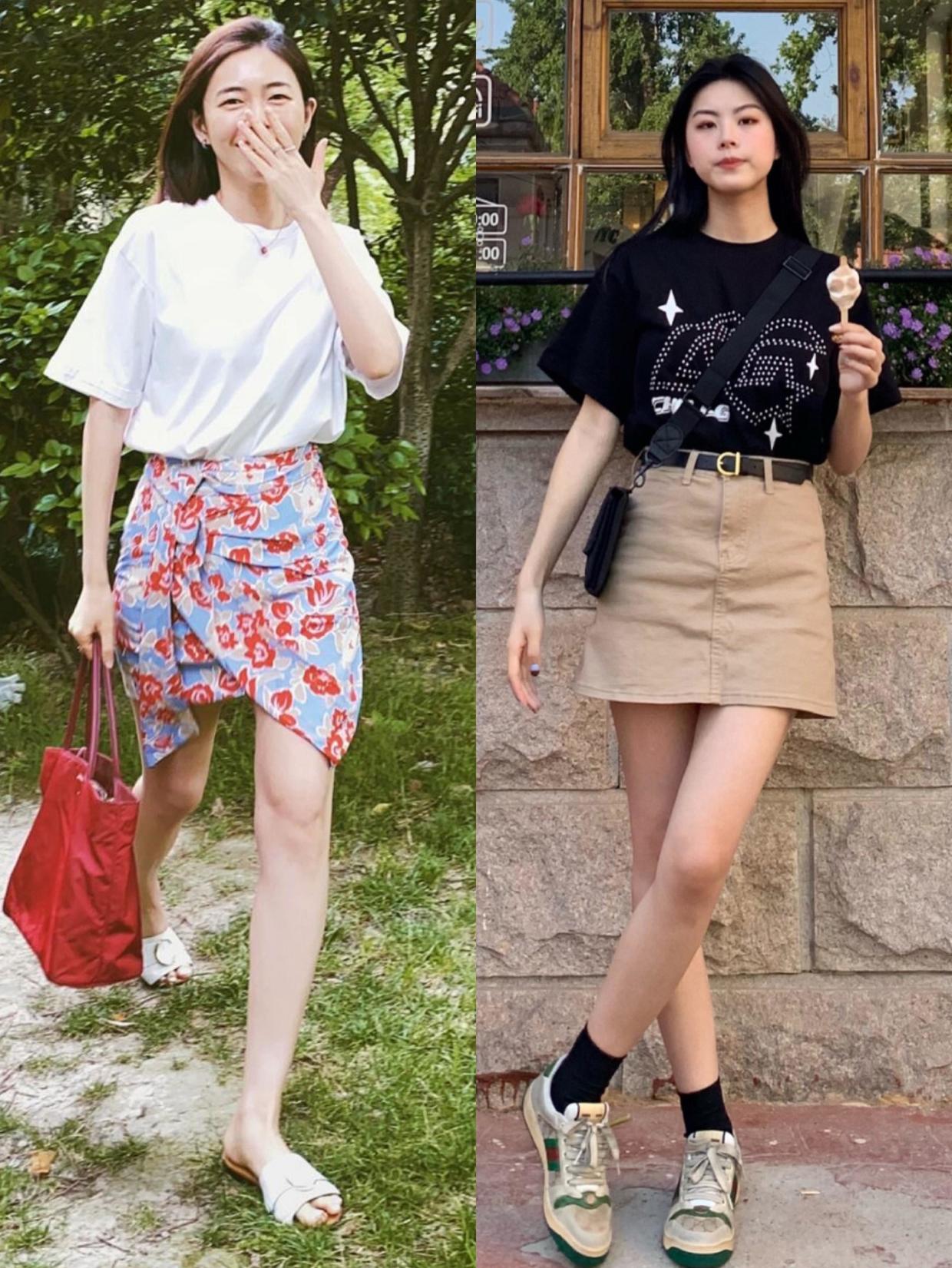 T-shirts tend to make the whole person look more casual when worn on the body. At this time, paired with a skirt, it will look more feminine. If you want to pursue a high-end look, you can wear a printed skirt under a solid color T-shirt. Although this style is simple, it can also show a charming side. If you are aliveIf you want to show off your cool beauty, then a workwear-style skirt will be a better choice.