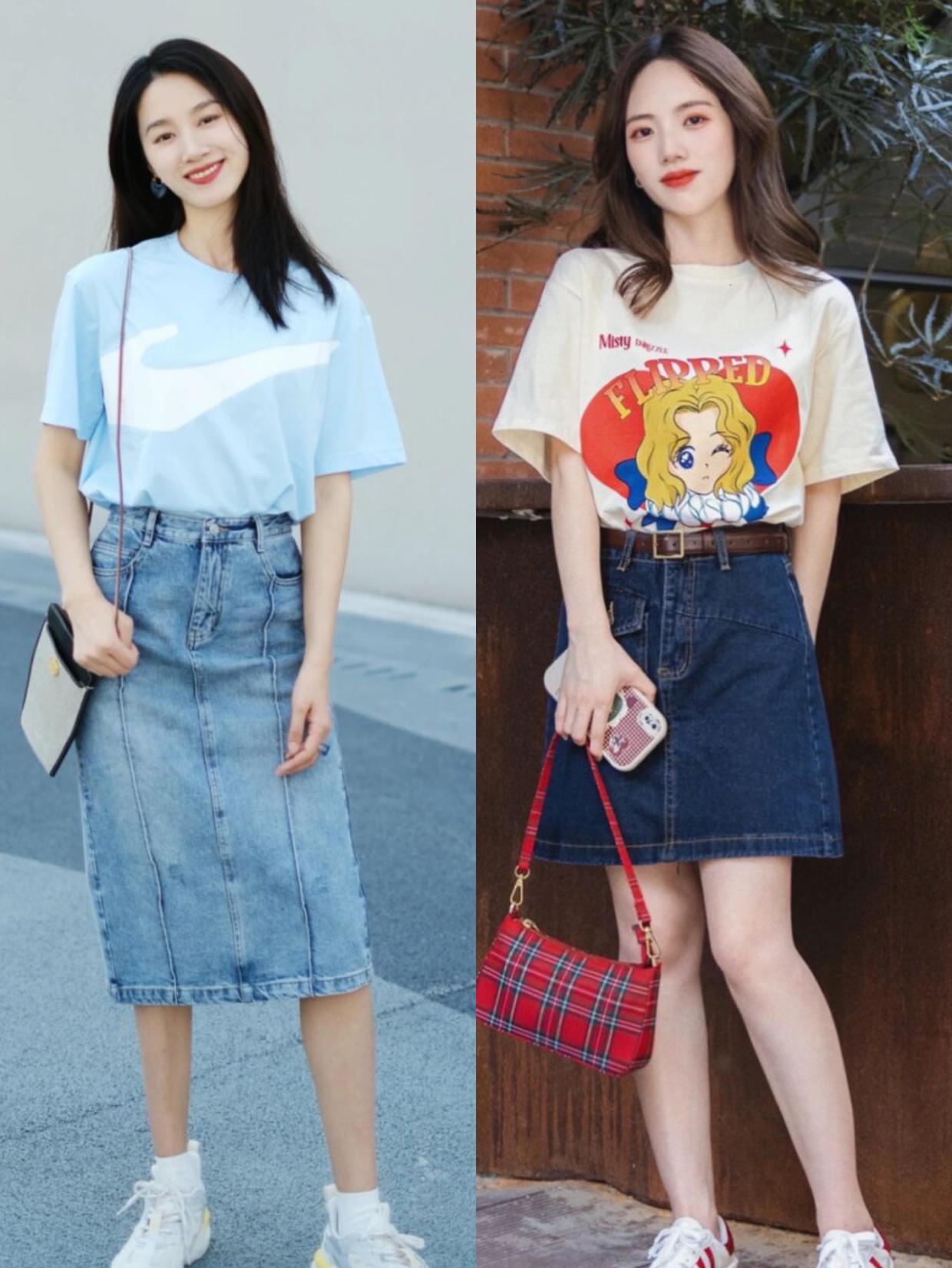 If ordinary skirts can’t meet everyone’s dressing needs, then you might as well try denim material. Combined with a skirt, it has a youthful feel. The styles of such skirts and T-shirts are relatively similar, and the two will not feel inconsistent at all when paired together.