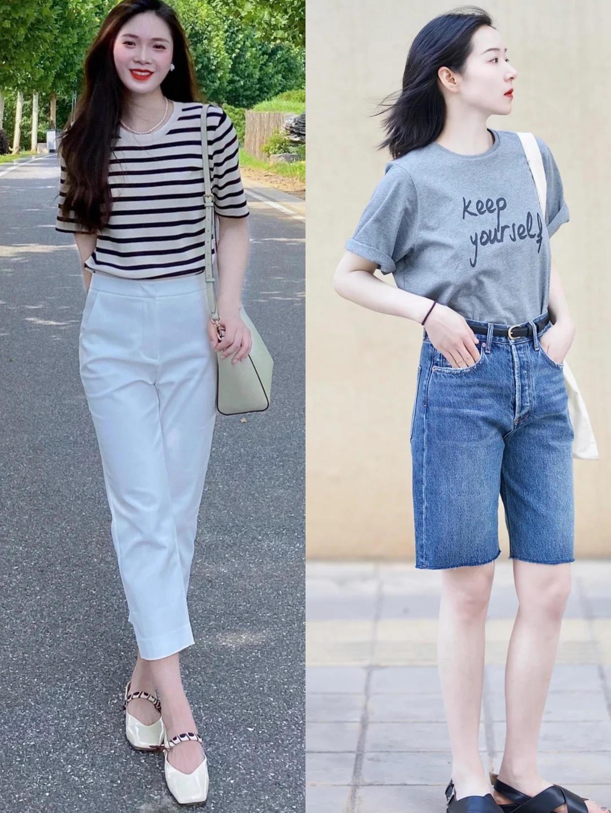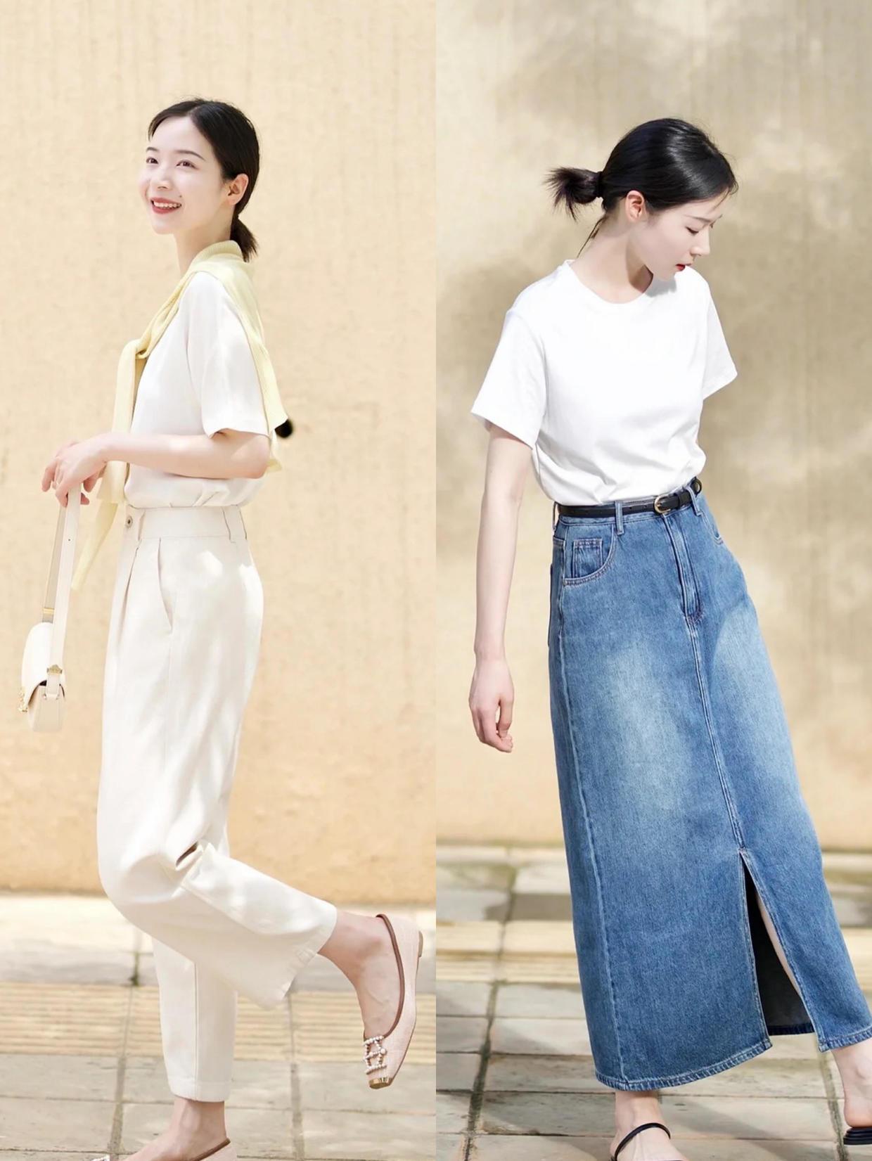 Wide-leg pants paired with a T-shirt are simple and fashionable. Loose wide-leg pants or straight-leg pants like these are also very suitable for pear-shaped figures. They are quite refreshing when paired with a T-shirt. In addition, you can pair them with sandals and High heels can make your legs slimmer and longer, giving you a more sophisticated look.