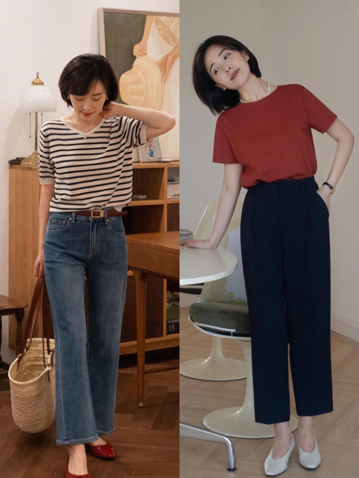 Summer The first skill you need to master when wearing a T-shirt every day is to tuck in your trousers. No matter what your figure is, you can tuck your T-shirt into the waist of your trousers. This matching method directly adjusts our figure and looks particularly elegant. These shorts T-shirt tucked into high-waisted pants can make you get longer legs.