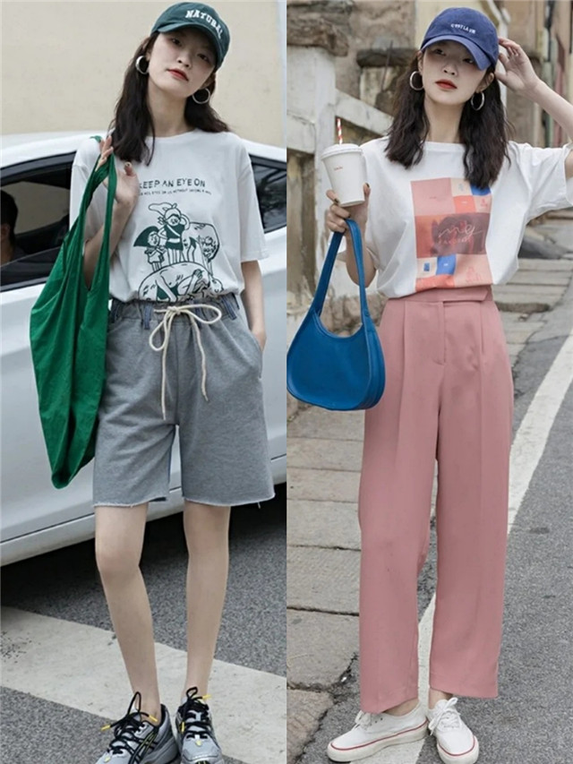 There are many combinations of T-shirts. First of all, you can Try pairing these casual trousers with a T-shirt every day. It is easy to carry with you. You can wear shorts or long trousers in summer. You can consider these wide-leg pants, which not only cover the fat on your legs, but also can Reflects fashion sense.