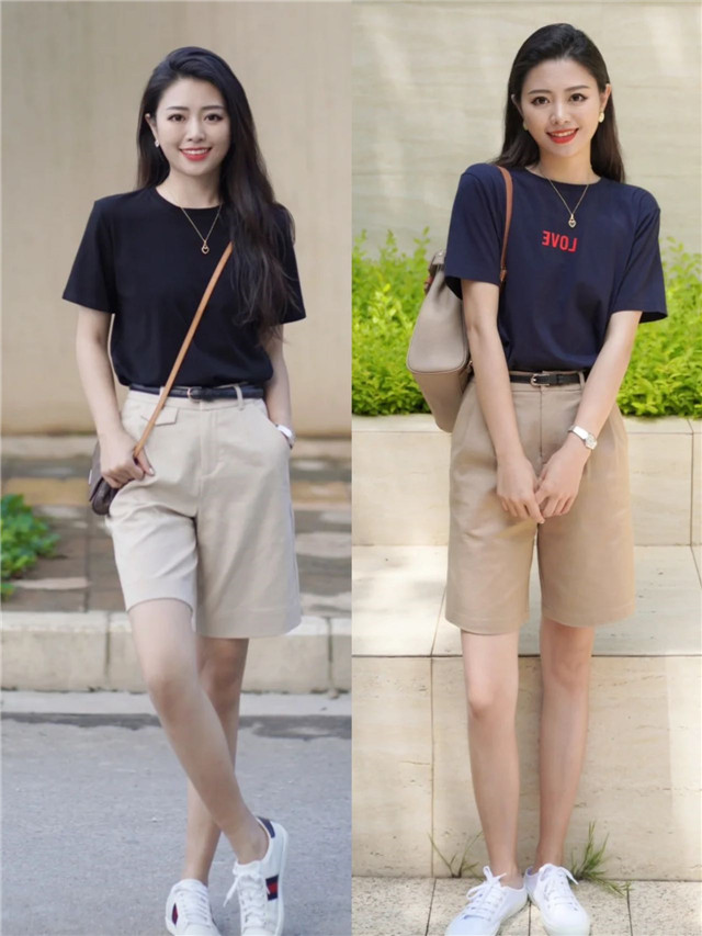 T-shirts paired with shorts are more refreshing. If you want to show off your good figure and have thin calves, you can wear these loose suit shorts with a T-shirt, which not only retains the casual feel of the T-shirt, but also adds a touch of elegance. Wear it like this when going to work. It’s okay, it won’t feel too casual.