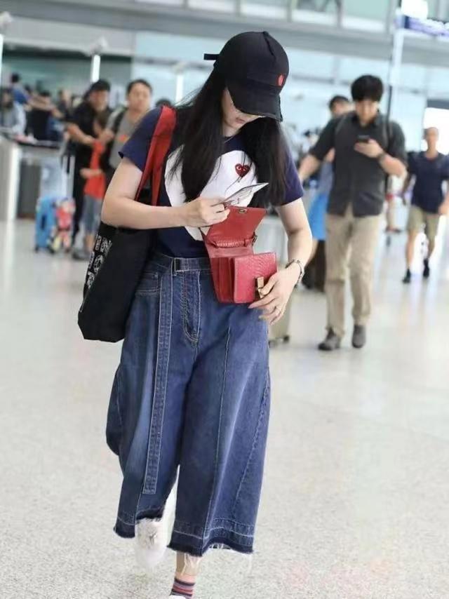 Wang Yan also combined it with a red crossbody bag to decorate it. The bag is a very practical item, and it can not only hold things, but also modify the figure, just like Wang Yan’s matching below The red crossbody bag contrasts with the color of this navy blue T-shirt. The combination of dark and light colors can also show a sense of hierarchy.