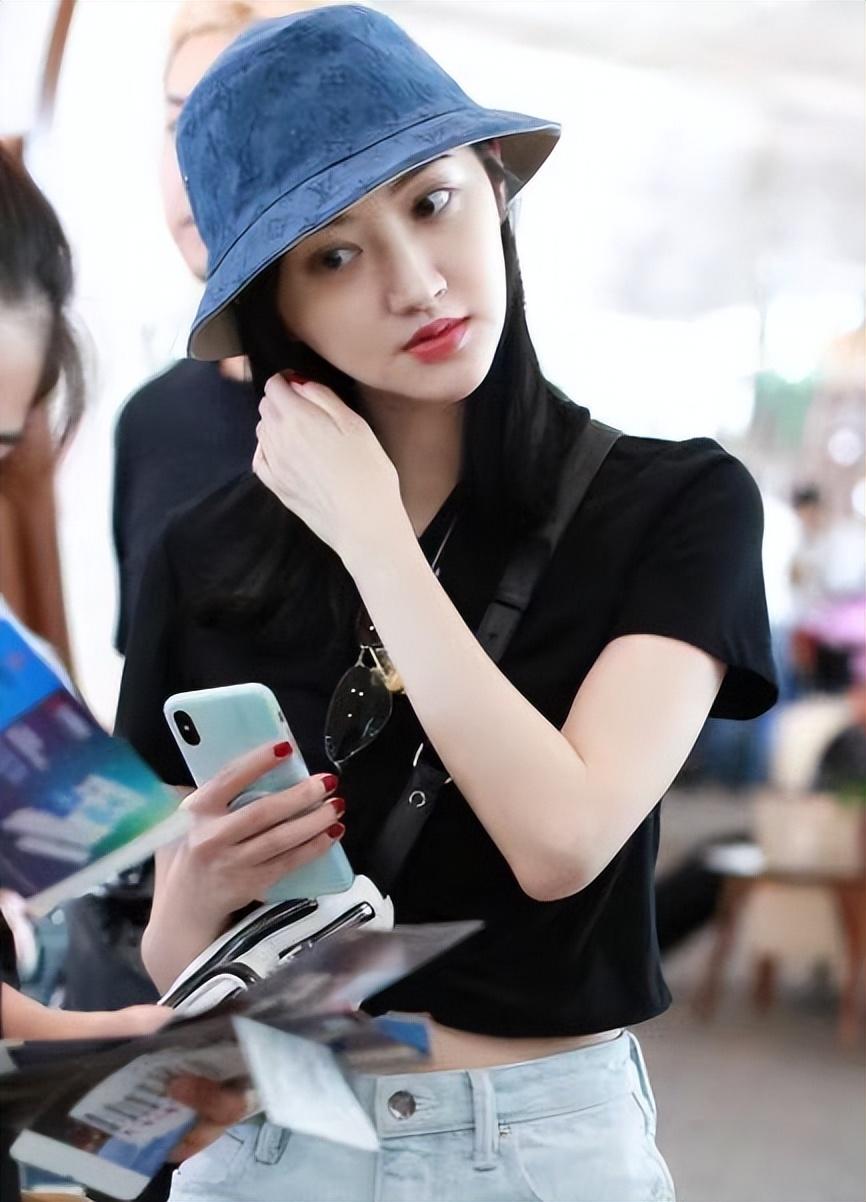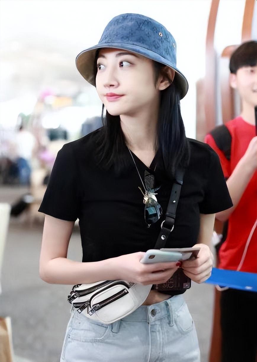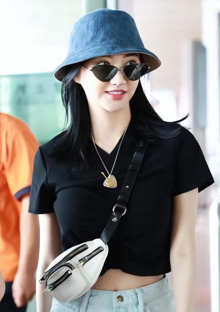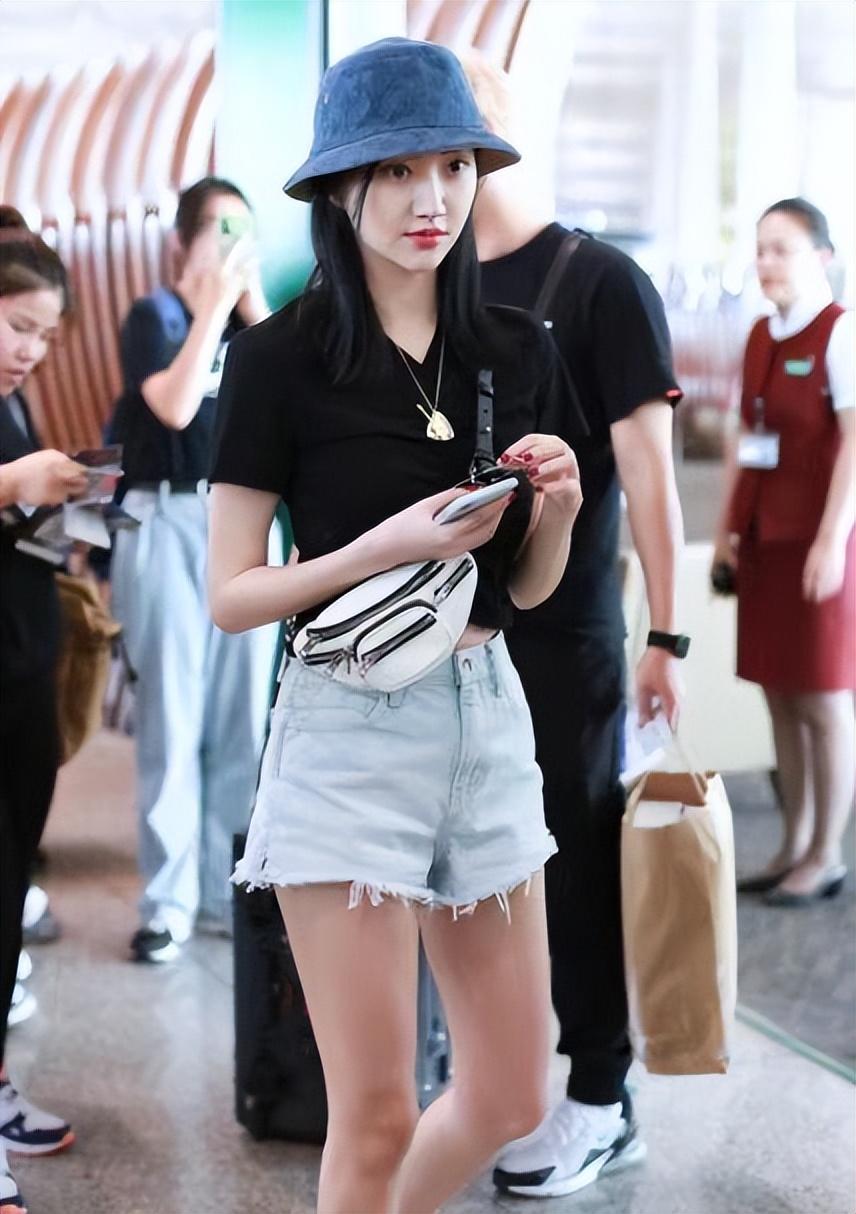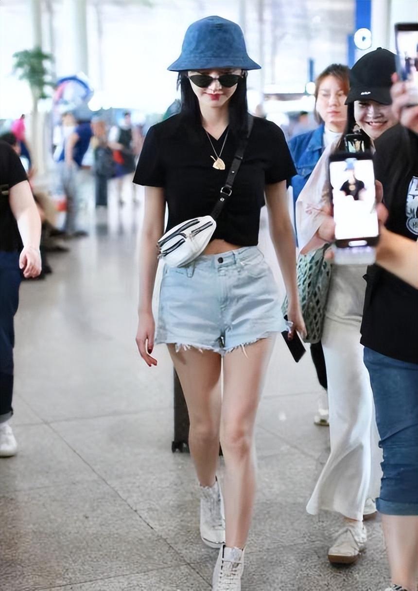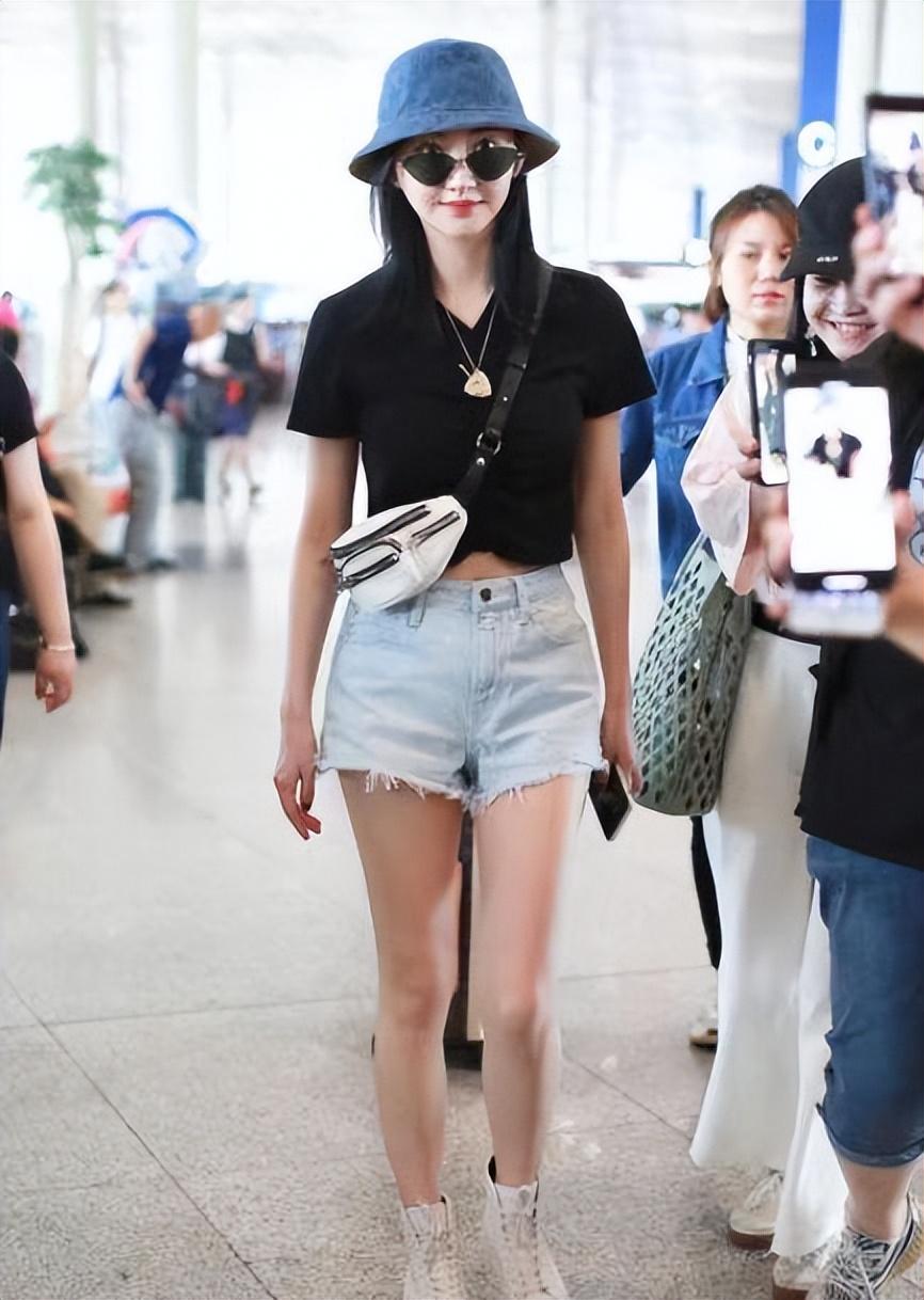 Female stars in their daily lives The matching is actually quite simple and casual, just like Jing Tian wore a black T-shirt and denim shorts this time. Although this outfit is very simple, she has a good figure, so she can also show off her appearance with such simple clothing. Her figure curves, showing her long legs and small waist, are still very beautiful.