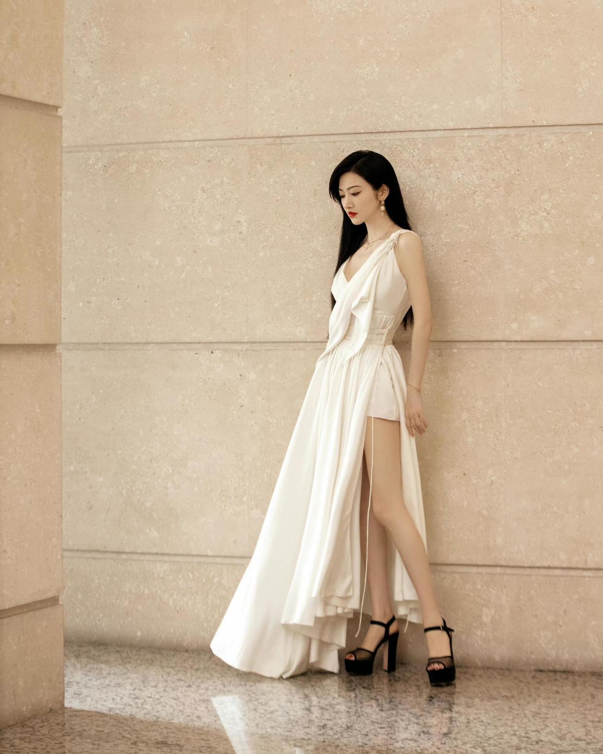 Simple white dress is a relatively classic item. This pure white dress is simple and elegant in style. Even for older women, it is not difficult to match. Moreover, when you wear this kind of long skirt, you can combine it with a slit skirt. The skirt modifies the lines of the legs, just like Jing Tian modifies her long legs with this white slit dress, which is so beautiful.