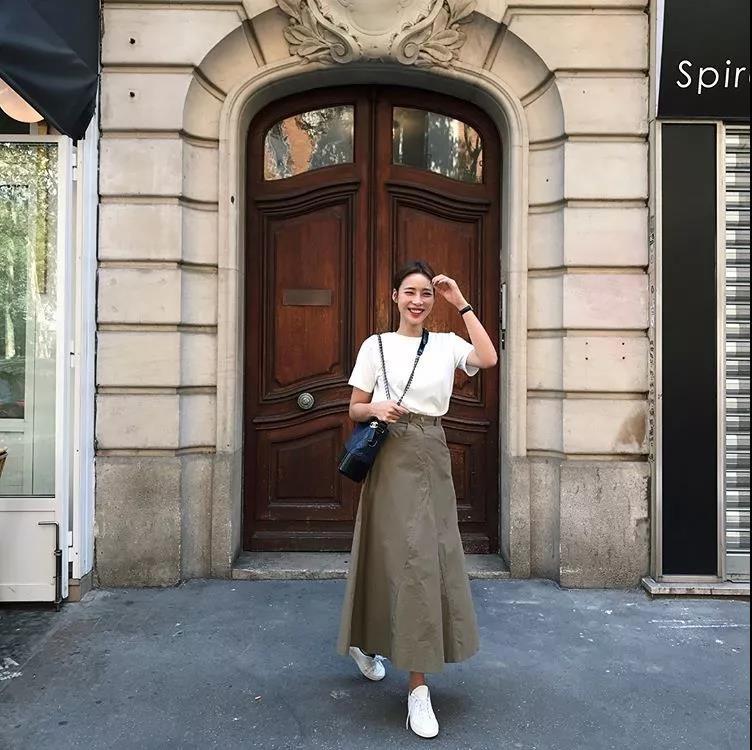 What kind of girl is a long umbrella skirt suitable for? Pear or hourglass shapes are available. In addition, it is also recommended for people with thick thighs. But be careful to control the length, never exceed your ankles, otherwise it may make you appear shorter. The fabric of this skirt is khaki, and paired with a white cotton T-shirt, it is urban, artistic and versatile.