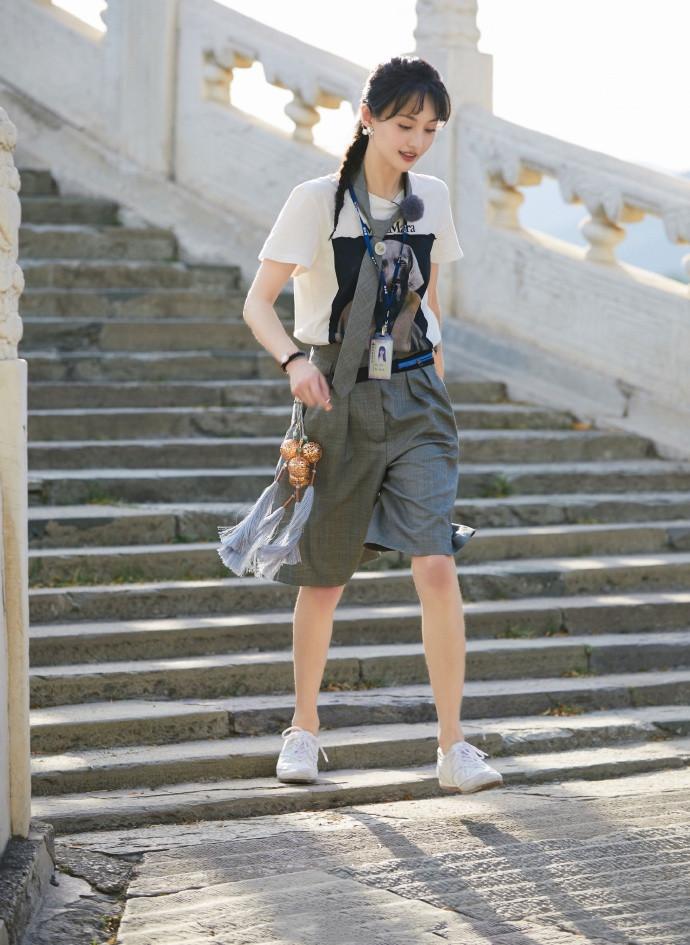 In this wayUsing playful patterns can make your look more neat and natural, coupled with low-key smoke gray three-quarter shorts , show off your slender legs, and at the same time make yourself look dignified yet lively and playful. In order to better match her trousers, she also uniquely added a gray tie, matching the formal tie with a white T-shirt. It may seem a bit nondescript, but it is this novel personality that highlights her personality. Be different.