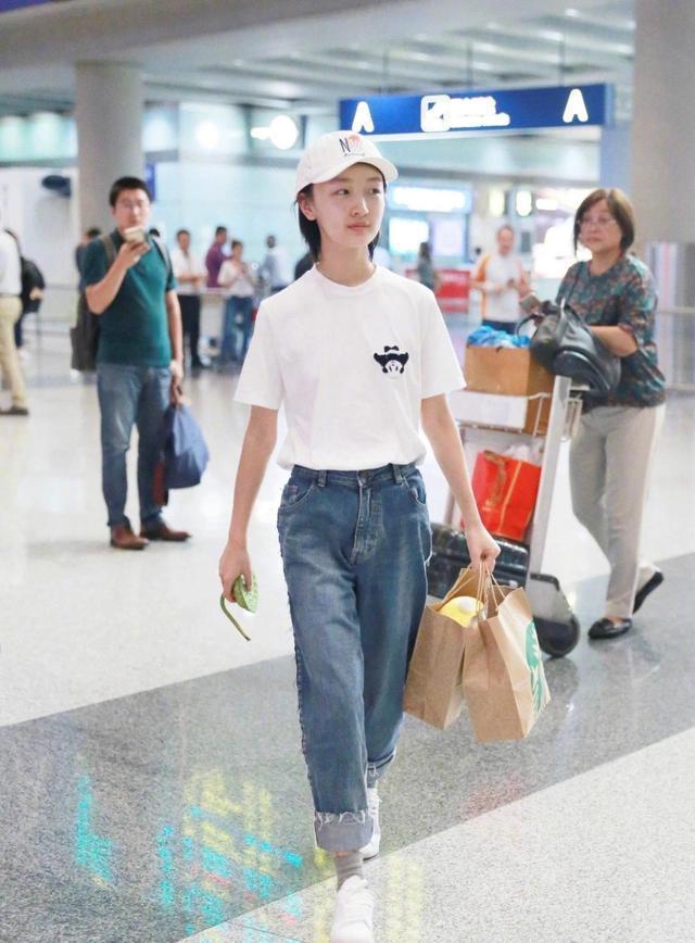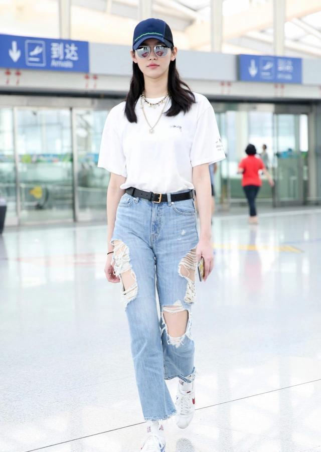 Many people always think white Although T-shirts are versatile and comfortable, the biggest drawback is that they look too rigid and cannot show your own personalized side. At this time, we might as well consider some with printed patterns when purchasing. white t. Zhou Dongyu cleverly chose a small-area printed pattern, which not only effectively breaks the monotony, but also enhances her sense of youth. Can you tell she is already 28 years old when she wears this? She looks exactly like a 16-year-old girl.