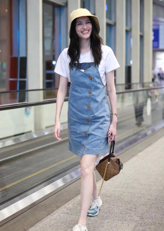 As a well-known model, He Sui used the trick of layering when matching white T-shirts. A white T-shirt with a simple print, paired directly with a denim suspender skirt, looks cute and personalized, and the refreshing combination of white and blue can create a more attractive look. Paired with a bright yellow fisherman hat, you instantly transform into a cute primary school student, making people excited.