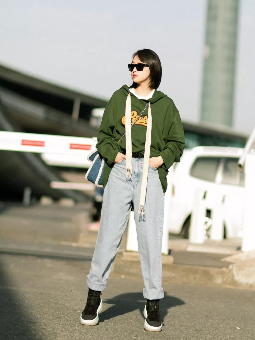 Color Darker sweatshirts, such as beautiful green or beautiful purple, can set off the skin tone. It also looks playful, fresh and energetic when worn. The lower body is paired with light-colored denim sports trousers. The cuffs of the trousers can be rolled up at will to look comfortable and casual. It can also be worn with a belt to outline a slender figure. A pair of comfortable sneakers or sneakers can give you a relaxed and leisurely look, and the youthful feel is also great.