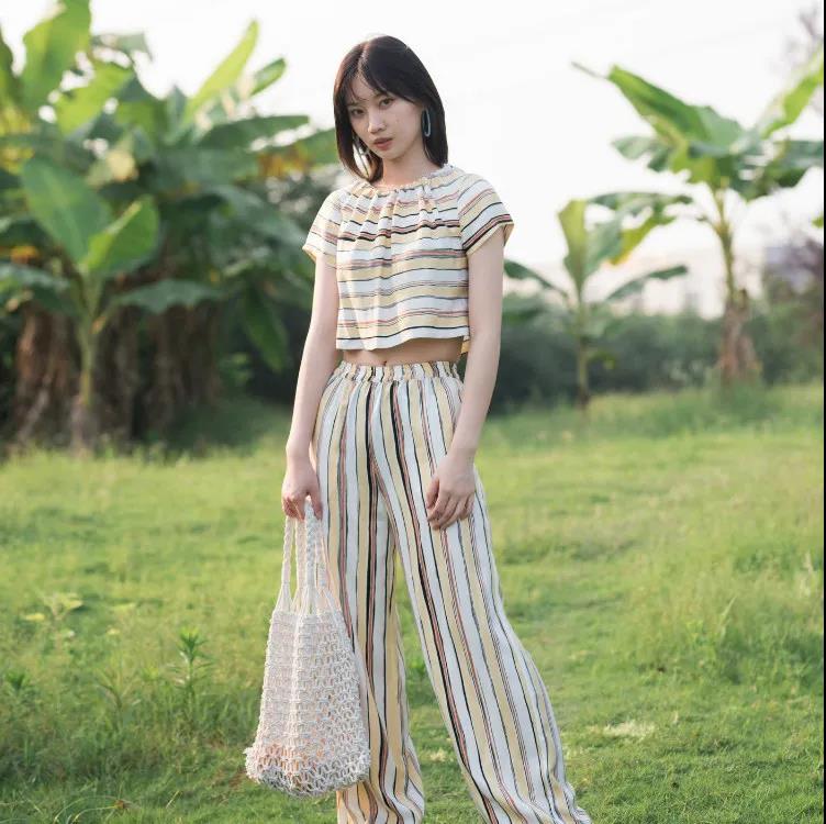 The neckline design of this shoulder-padded T-shirt is very distinctive, and the elastic pleated elements are gentle, casual, and very low-key. The striped design is full of gentle style, and the several tones appearing in this outfit are all elegant and fresh. The lower body of casual pants and a shoulder-padded T-shirt form a complete set, which is simple, low-key and rustic. The handbag is designed in a light pink fishnet style, full of elegance, tranquility and romance.
