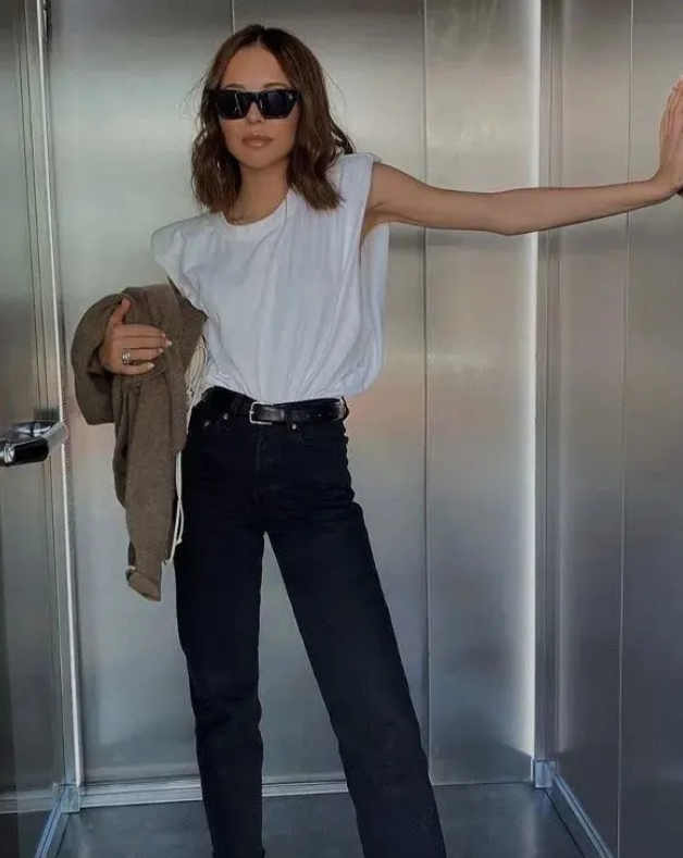 Jeans and a black belt give it a casual and retro vibe. The upper body is a pure white round neck T-shirt with shoulder pads. This combination makes the armpit lines very beautiful and can also highlight the slender and graceful figure. In the morning and evening, you can choose a soft knitted sweater to match it, which is pure, elegant and very casual. Pure black sunglasses add a cool vibe and are gentle yet domineering.