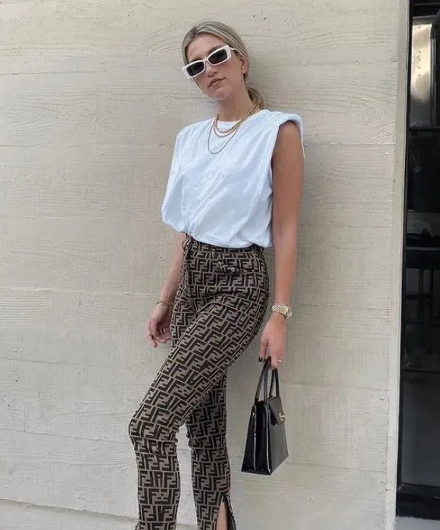 Pure white shoulder-padded T-shirt although very stylish Simple, but the details are very advanced. Generally speaking, this piece is relatively loose, so it has exquisite pleat elements. It is gentle yet contains sassy charm. The casual pants are a pair of brown printed designs with slits at the legs to add a sexy touch. The golden three-layer necklace echoes the watch, noble and capable. A pure black handbag adds a stable and high-end style.