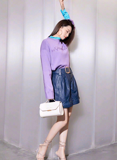 Correct demonstration 1: taro purple sweatshirt + leather shorts