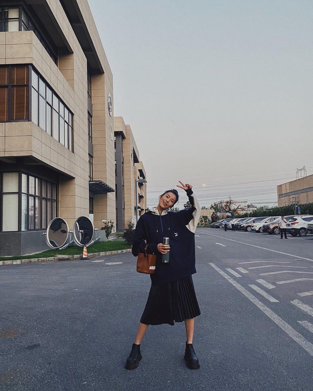 Correct Demonstration 2: Loose half-zip sweatshirt + high-waisted pleated skirt