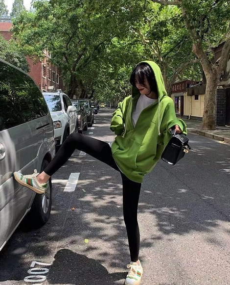 For example, with the help of this loose hooded sweatshirt, our waist, abdomen and hip curves can be well covered, and with the help of tight pants, our waist, abdomen and hip curves can be well covered. The curves of the legs are more prominent, which is very suitable for girls with apple-shaped figures to try.