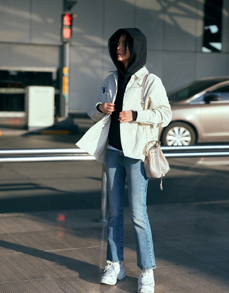Pair a black hooded sweatshirt with a white denim jacket, using a minimalist black and white color scheme to present a high-end fashion sense, and then choose a pair with modified legs The straight-leg denim pants with a stylish design give our look a unique and fashionable charm through a simple, casual and retro look.