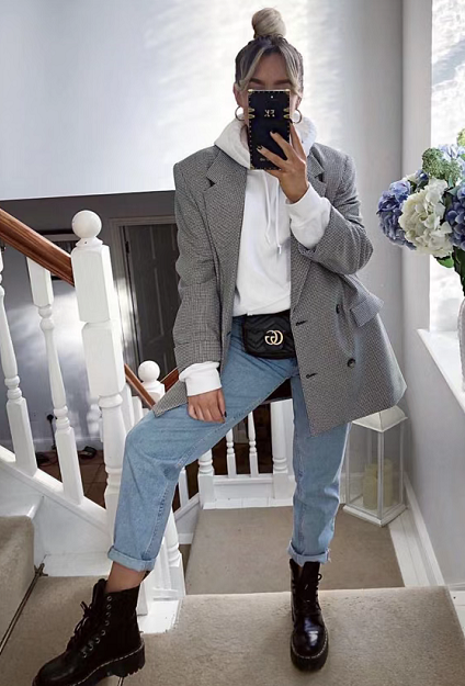 In this set of combinations, if we want to have a more street-like feel, we need to have certain casual elements in our outfits. A white hooded sweatshirt, paired with flesh-covering denim wide-leg pants, presents a casual posture, and the design of a waist bag is superimposed to make the trendy atmosphere more intense.The suit jacket with elegant small plaid design can easily have a fashionable street effect.