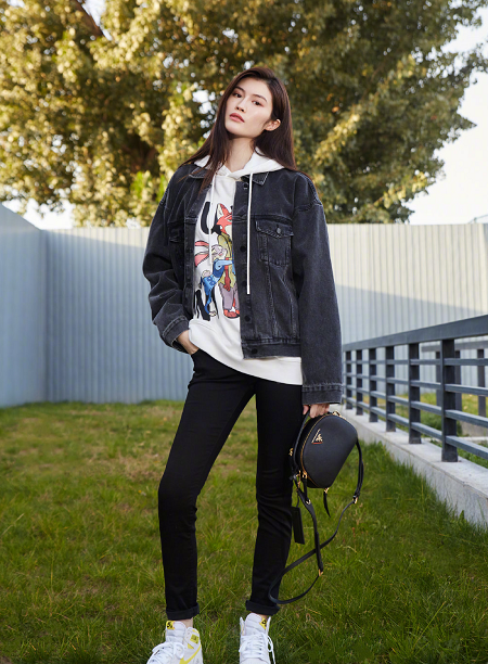 A white hooded sweatshirt with colorful prints, in a clean color scheme, shows a casual and playful feel. Paired with a pair of black pants, it outlines the shape of the legs. At the same time, use a black denim jacket to make your figure look slimmer and slender.
