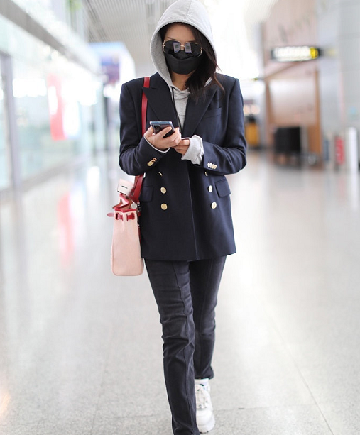 A gray hooded sweatshirt, paired with a pair of black casual pants. The slightly slim design has a better modification effect on the leg shape. Wear a black college-style suit with metal buttons to keep the look from looking too ordinary.