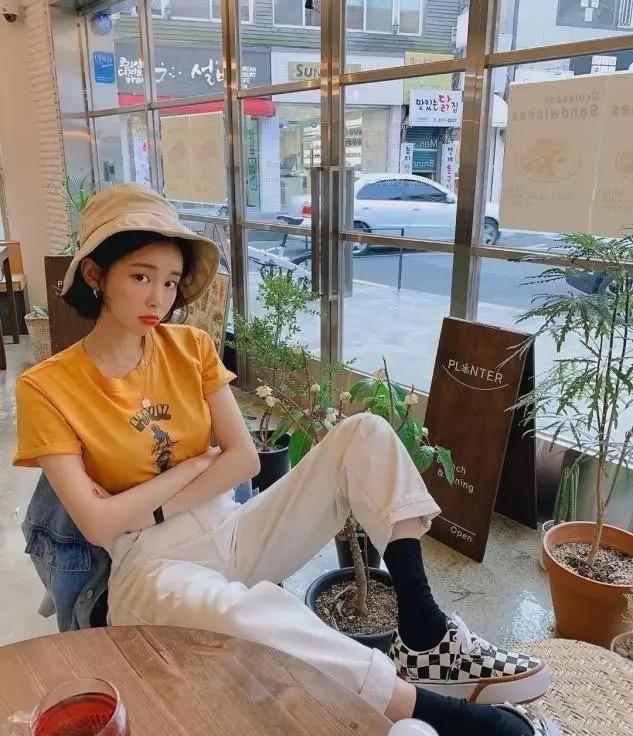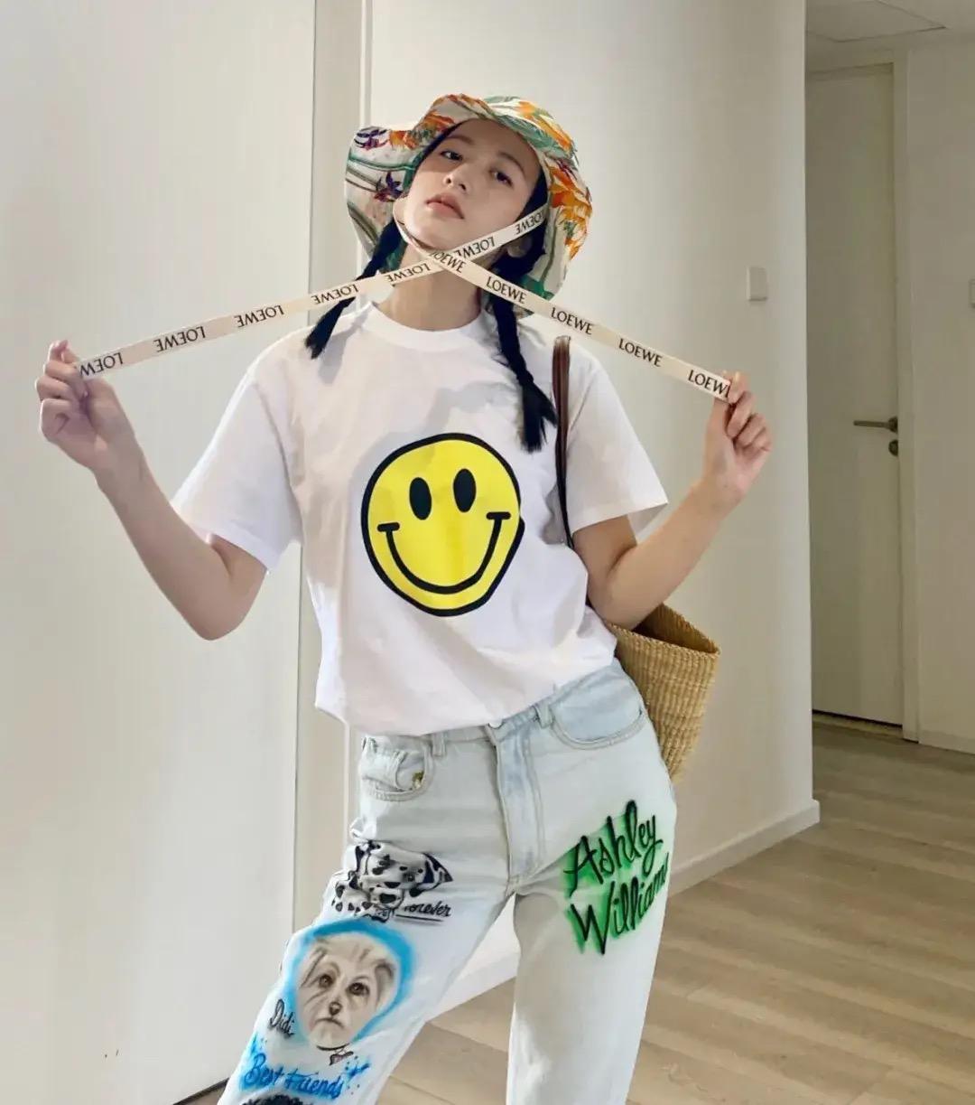 HoweverIt is not recommended for girls to wear bright yellow tops, ginger with pattern printing will be more lively, the lower body is paired with white jeans, the collision between colors Very layered.
