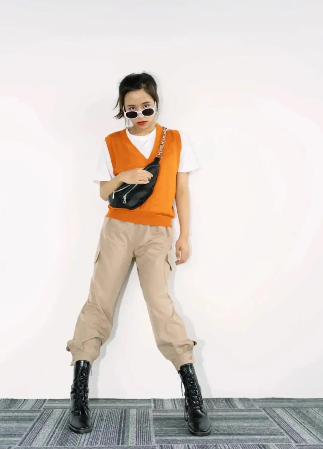 If you like a neutral and handsome style, you can wear a T-shirt as an inner layer, layer an orange vest, and match the lower body with khaki overalls and black Martin boots, a cool match and very layered.