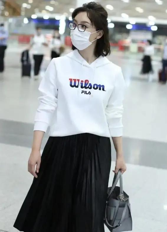 Private clothing also completely broke through people’s perception of age. At a certain airport, she wore a white printed sweatshirt with her lower body Paired with a black pleated skirt, the overall look is very age-reducing. Sweatshirts don’t necessarily go with trousers. Follow Chen Shu’s approach to dress fashionably to reduce age and look elegant. It’s suitable for a 40-year-old woman!