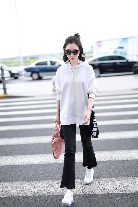 Chen Shu wears sweatshirts relatively frequently, wearing a mid-length white sweatshirt paired with black bell-bottom pants. The classic color combination is really age-reducing. The half-tied ponytail makes people look very stunning. It is impossible to imagine that Chen Shu is already in his forties. The overall look is very casual and fashionable. Strong and very girly.
