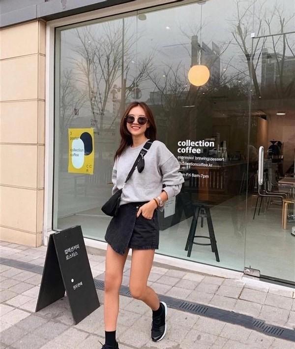 Skirts can also be paired with a neutral sports style gray sweatshirt and a black irregular skirt. Although the color is very dark, it is The overall vitality is very strong, which is very suitable for a vibrant season like spring.